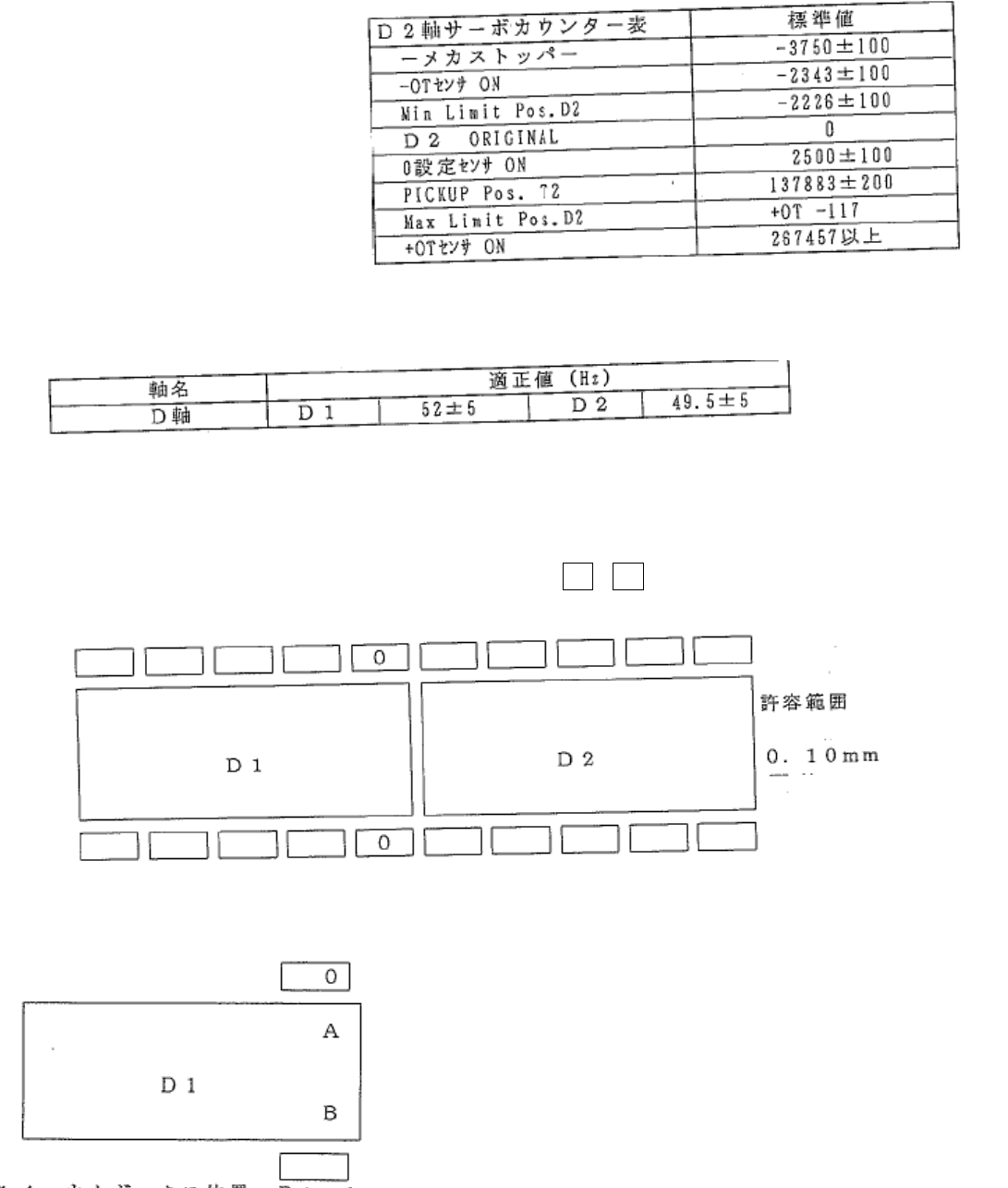 Timing belt 因 1 齿约有 127 pulse 的变化,设置在 3750±63puls e(D2-2750±63pulse) 。 (D1 轴 belt tension 52 ±5hz、D2 轴 belt tension 是 49.5±5hz、固定 D 轴马达 bracket torqu e 是 1 200kg) 2 根 Timing Table 规格、NO 等的收集。 Timing Table 伸展后、再次记录在 tabl …