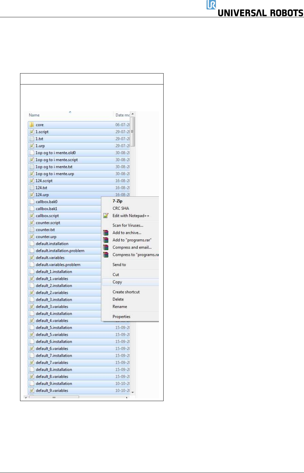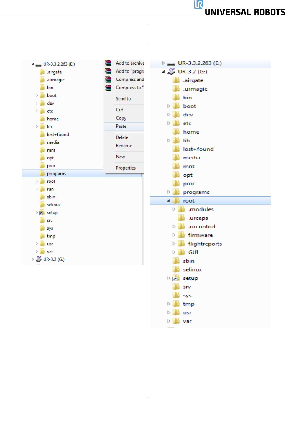 保留所有 权 利 107 Servicemanual_UR1 0_en_3.2.6 CB3 导航至 UR -USB ,右键单击 “ 程序 ” 文件夹, 然后选择粘贴。 导航至 CF 卡上的根文件 夹