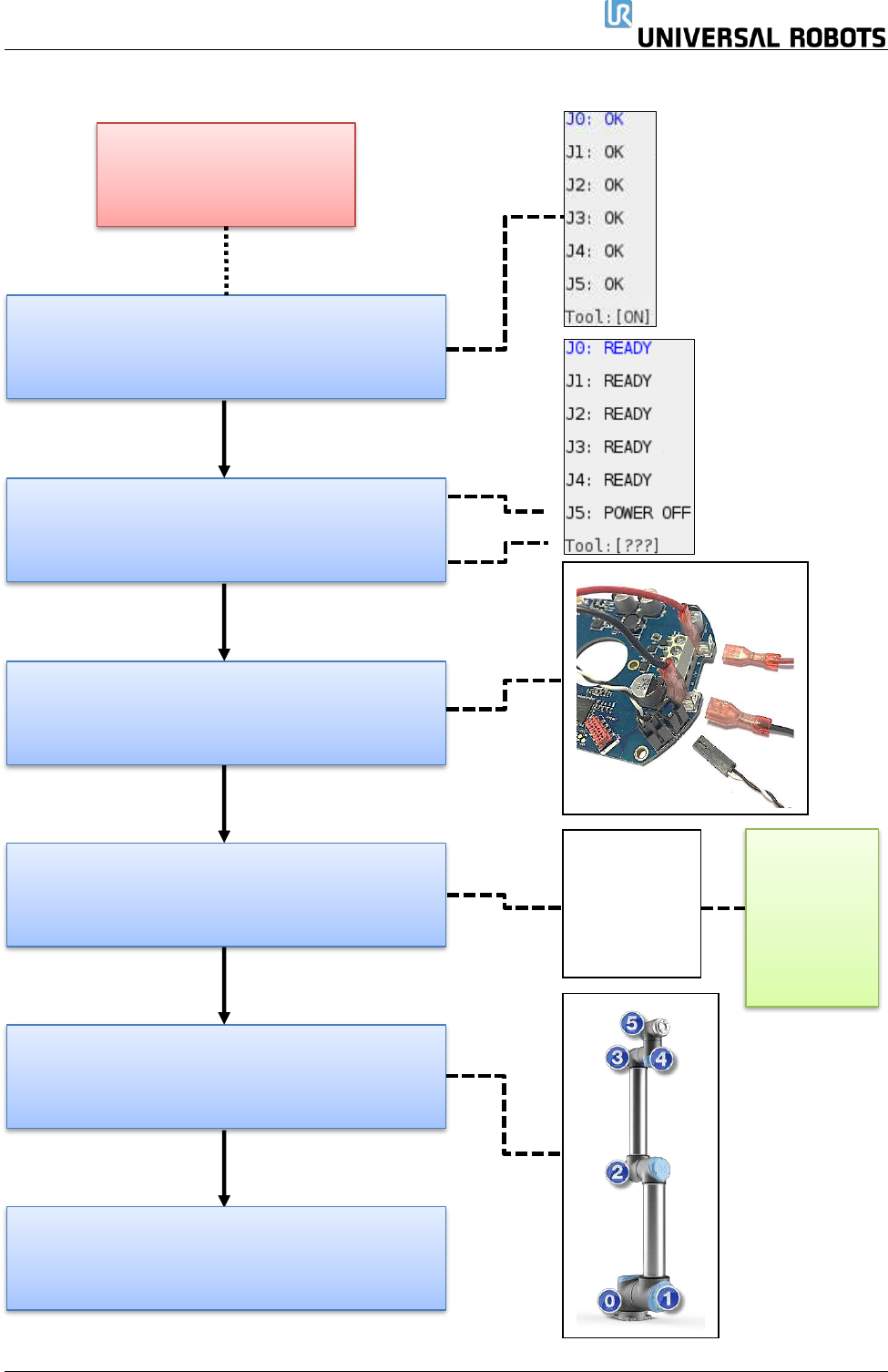 保留所有 权 利 148 Servicemanual_UR1 0_en_3.2.6 5.3.6 与关节和工具 的通信 检查 控制箱 的 电缆 与控 制箱的 连 接。 检查是否与关节和工具 通 信 如果存在通信问题, 检查关节上有通信问题 的连接端子 和电线以及 之前的关节。 没有与关节的通信将显 示 “ 关机 ” 与工具没有通信将显示 [???] 拆除除底座关节 (J0) 以外的所有电 源和通信连 接。 检查是否连接此关节。 转到专家模…
