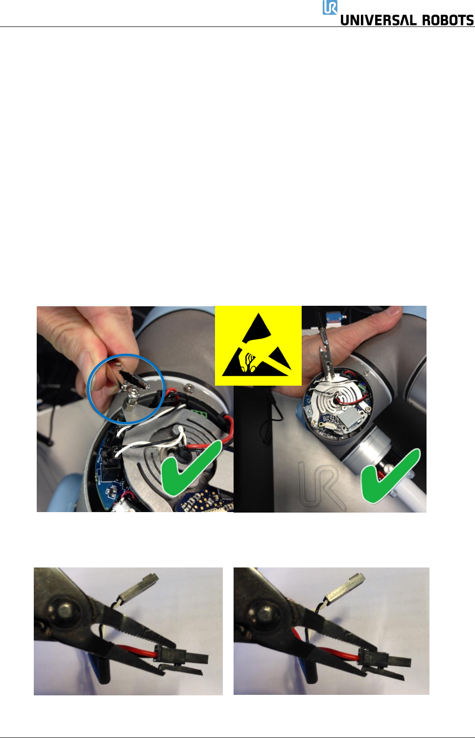 保留所有 权 利 24 Servicemanual_UR1 0_en_3.2.6 7. 断开电线 8. 拆下定位螺钉(较新的 关节外壳上 没有)。 9. 使用小平头螺丝刀或 类似工具, 轻轻取下黑色 柔性扁型环 ,并将其从关 节外壳上原来的位 置 向后拉动。 10. 将灰色的特氟隆环向后 滑动。 10 个螺钉 可见,关节两侧各 5 个。 使用开口扳手松开螺钉 ,每个大约 两整圈。 11. 将两个零件拉开,逆时 针轻轻扭转 约 5 度,直…