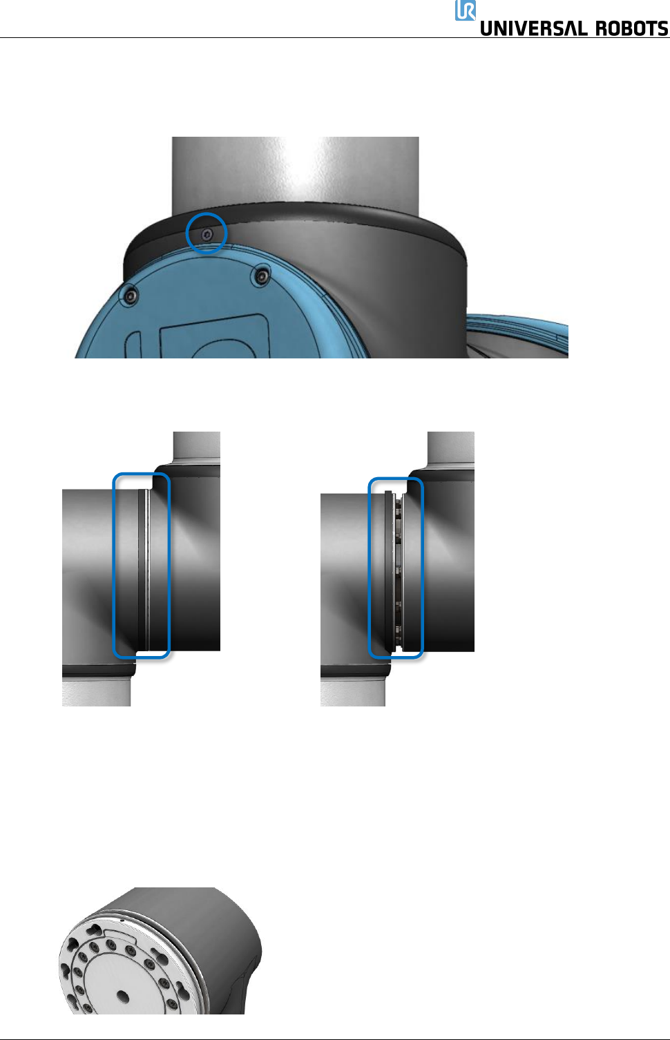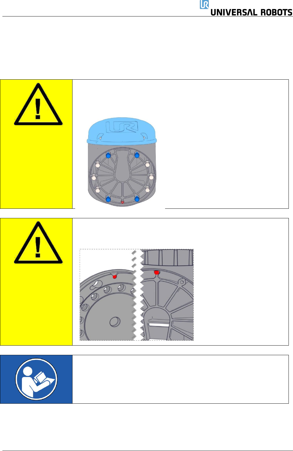 保留所有 权 利 25 Servicemanual_UR1 0_en_3.2.6 组装: 更换关节后,按照以下 步骤组装机 械臂。 1. 将螺钉和垫圈轻轻插入 关节外壳的 十个螺纹孔中 的每一个( 关节很可能已 经插入了这些孔) 。 小心: 将正确的螺钉放在正确的孔中至关重要。蓝色标记的螺钉比其余的 短。 小心: 组装前,对准丝锥应当 对准。如果 丝锥彼此相对 (偏移 18 0 度),关节 无法正确合并,且随着 时间的推移 ,关节自身有…