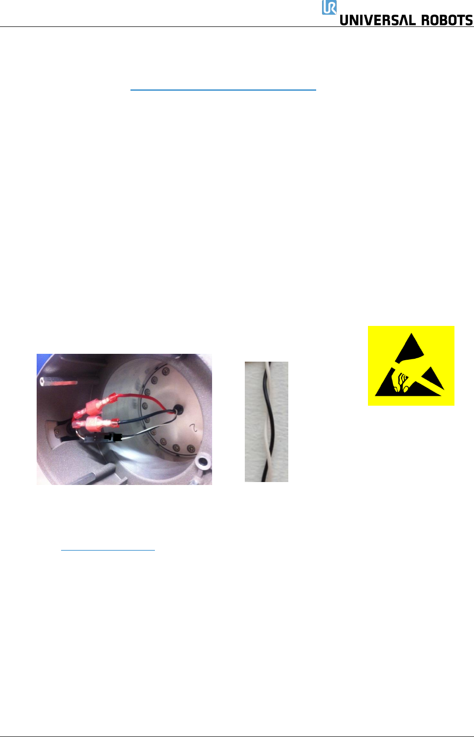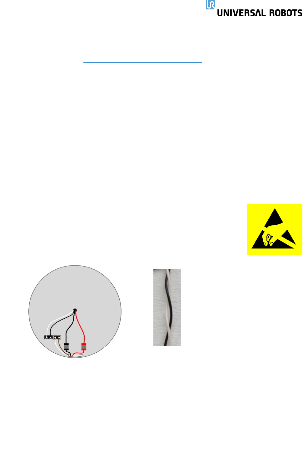 保留所有 权 利 42 Servicemanual_UR1 0_en_3.2.6 3.1.11 手腕 1 关节 – 下臂 拆卸 有关详情和照片,请参 见: 3.1. 4 将关 节 与配 对 关 节 分离的一般指 引 关闭控制器。 1. 拆下手腕 1 关节上 的蓝色盖子。 2. 连接防静电腕带 3. 断开下臂与手腕 1 关节之间的电线 。 1 x 红色电线 = 48V DC 1 x 黑色电线 = 接地 黑色连接器 = 总线电缆(注意连 接…