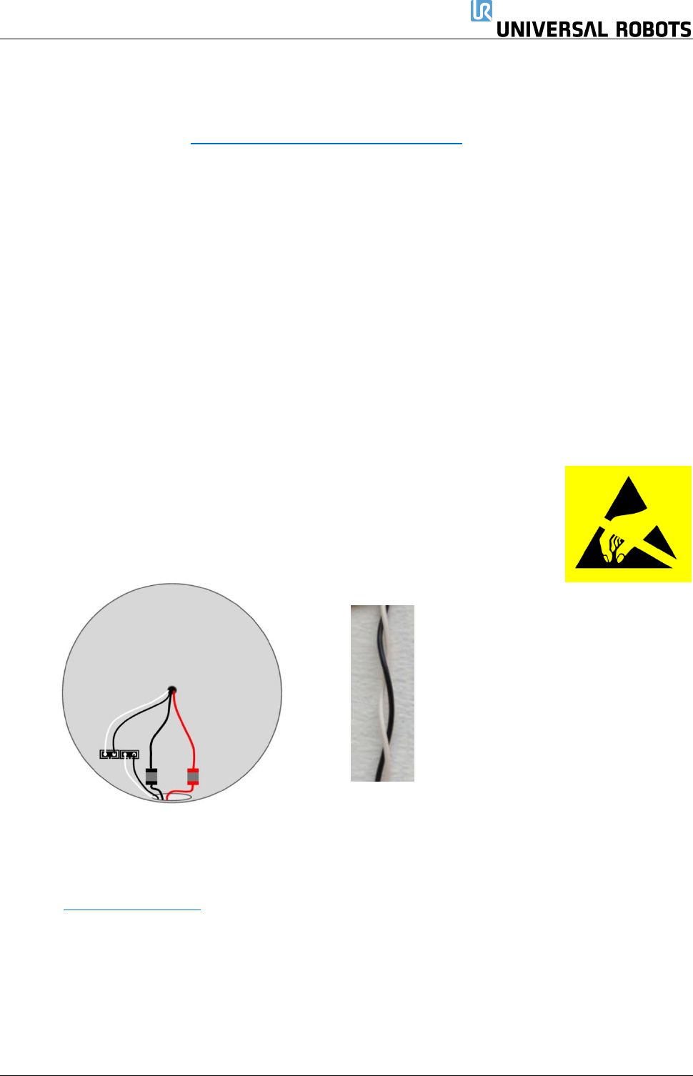 保留所有 权 利 44 Servicemanual_UR1 0_en_3.2.6 3.1.12 手腕 2 关节 – 手腕 1 关节 拆卸 有关详情和照片,请参 见: 3.1. 4 将关 节 与配 对 关 节 分离的一般指 引 关闭控制器。 1. 拆下手腕 1 关节上 的蓝色盖子。 2. 连接防静电腕带 3. 断开手腕 1 关节与 手腕 2 关节之间的电线 1 x 红色电线 = 48V DC 1 x 黑色电线 = 接地 黑色连接器 = 总…