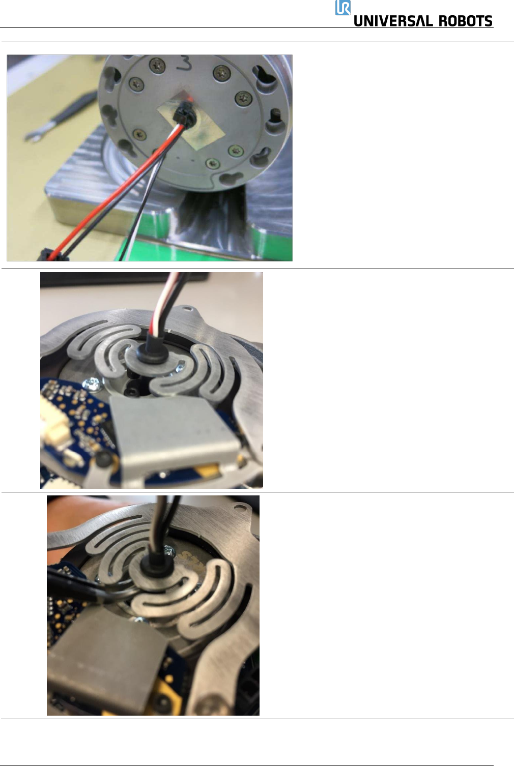 保留所有 权 利 63 Servicemanual_UR1 0_en_3.2.6 尺寸 4 – 零件号码: 103504 • 从线束上拆下两个索环。 • 将索环安装在支架上。 • 拉动线束穿过关节。 请注意,肩部和底座关 节上的电线 需要 不同的布置方式。请参 见照片示例 。 肩部 底 座