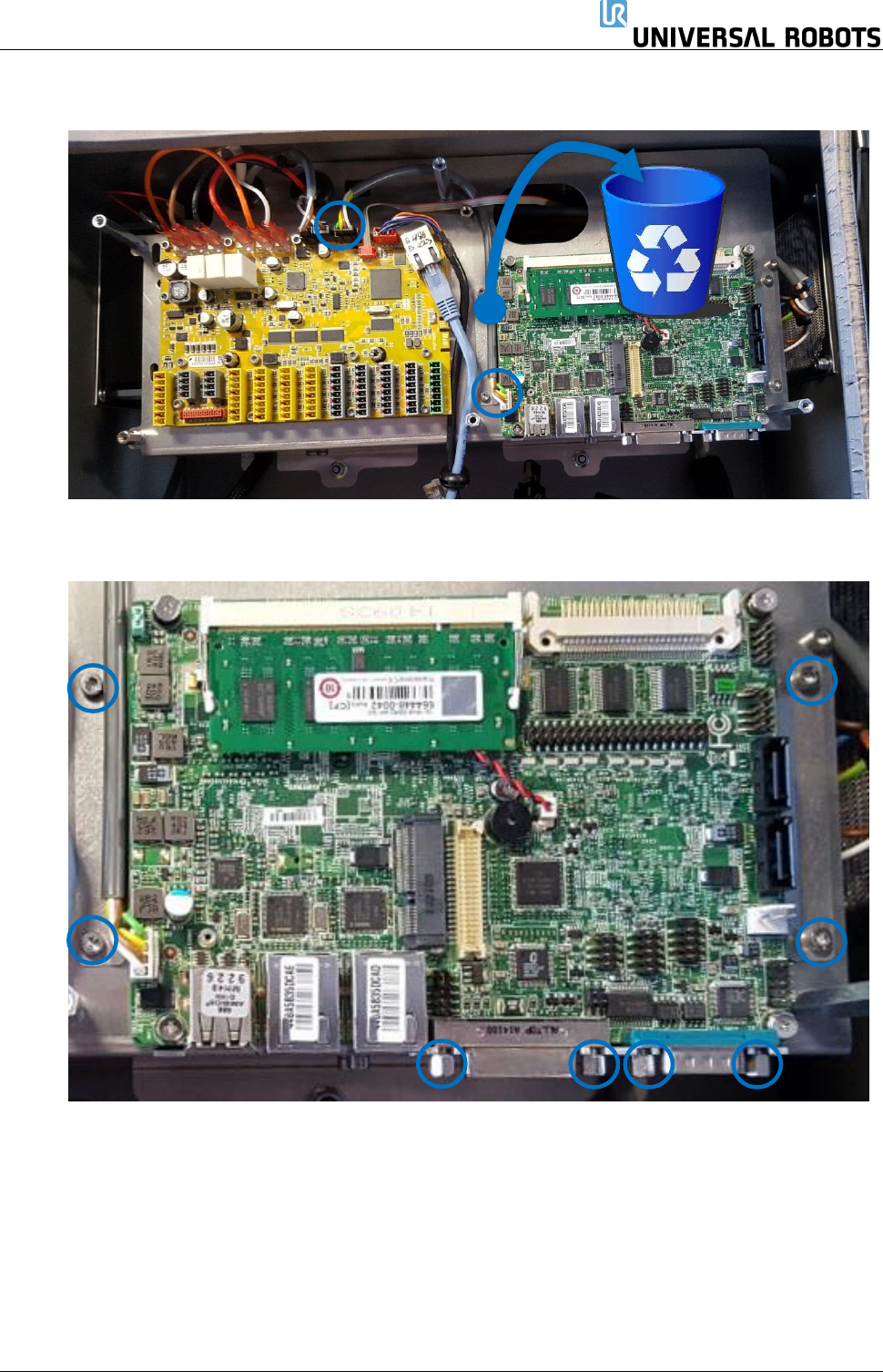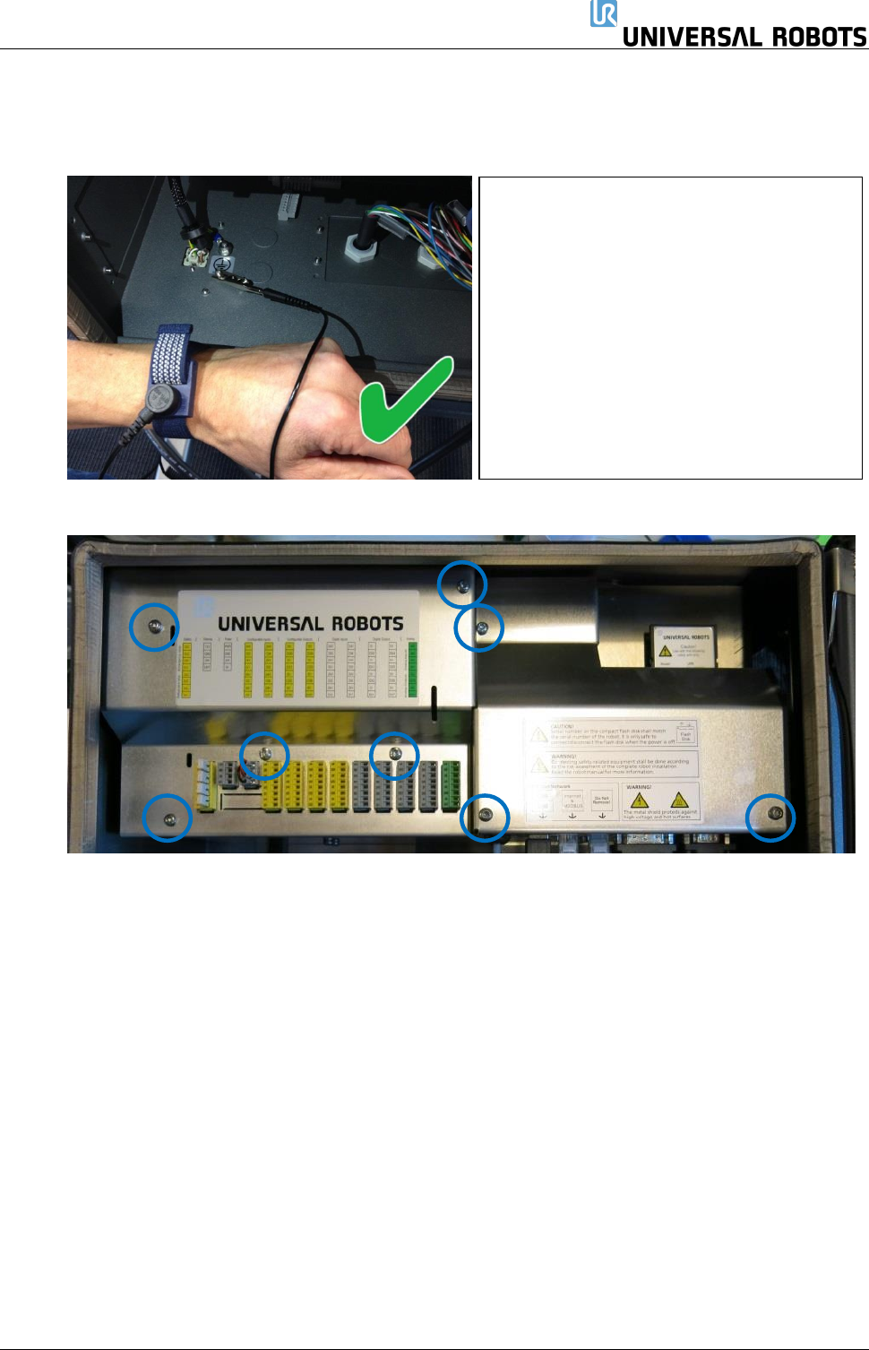 保留所有 权 利 76 Servicemanual_UR1 0_en_3.2.6 3.2.3.1 硬件 • 操作控制器时,请务必 使用防静电 腕带。 • 拆下 7 x T20 梅花头螺 钉,将护板 拆卸下来。 • 拆下连接到主机板和小 型闪存卡的 所有电缆 将防静 电 腕 带 戴在手腕上。将 腕 带 与系 统 接地点 连 接 。 其可将身体内的 所有静 电释 放 到地面。