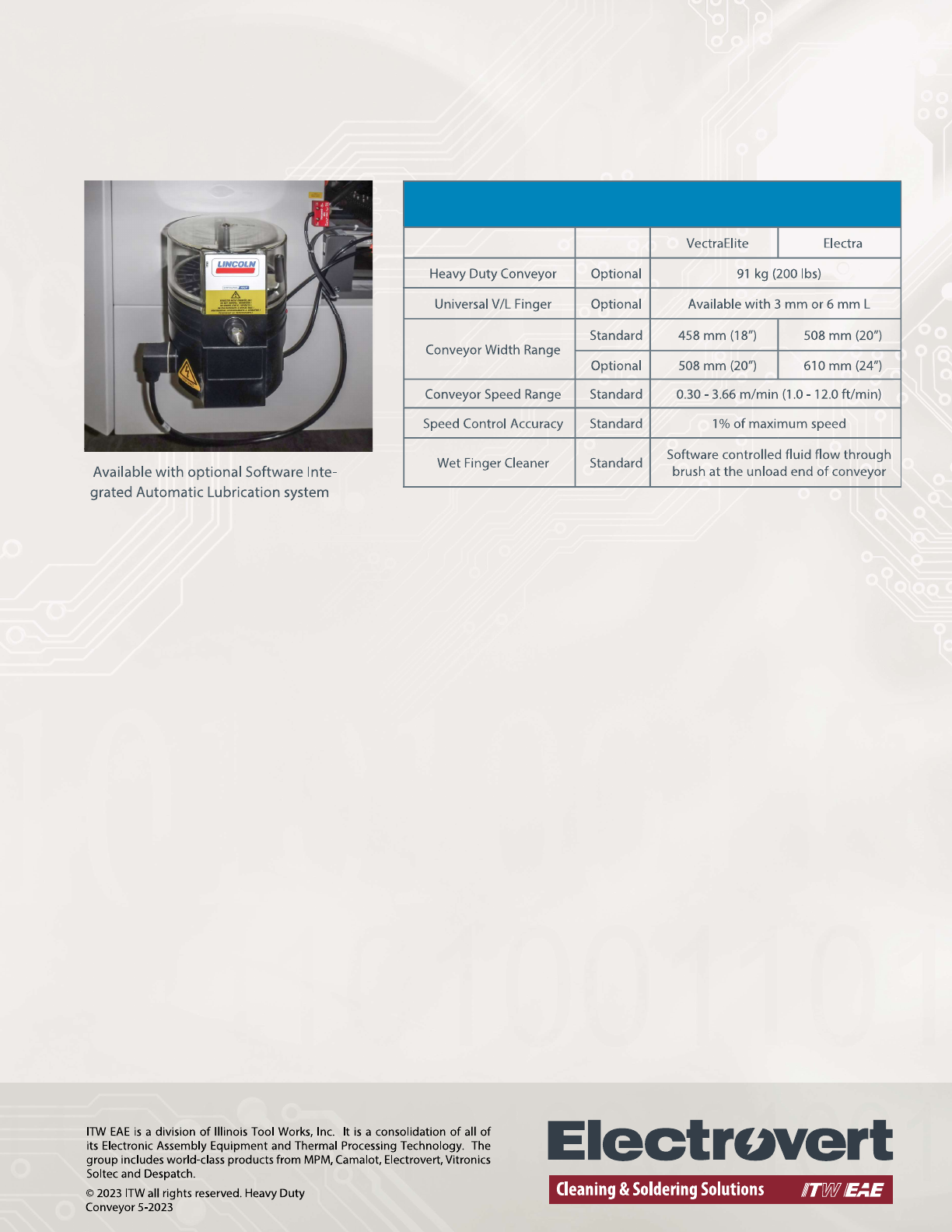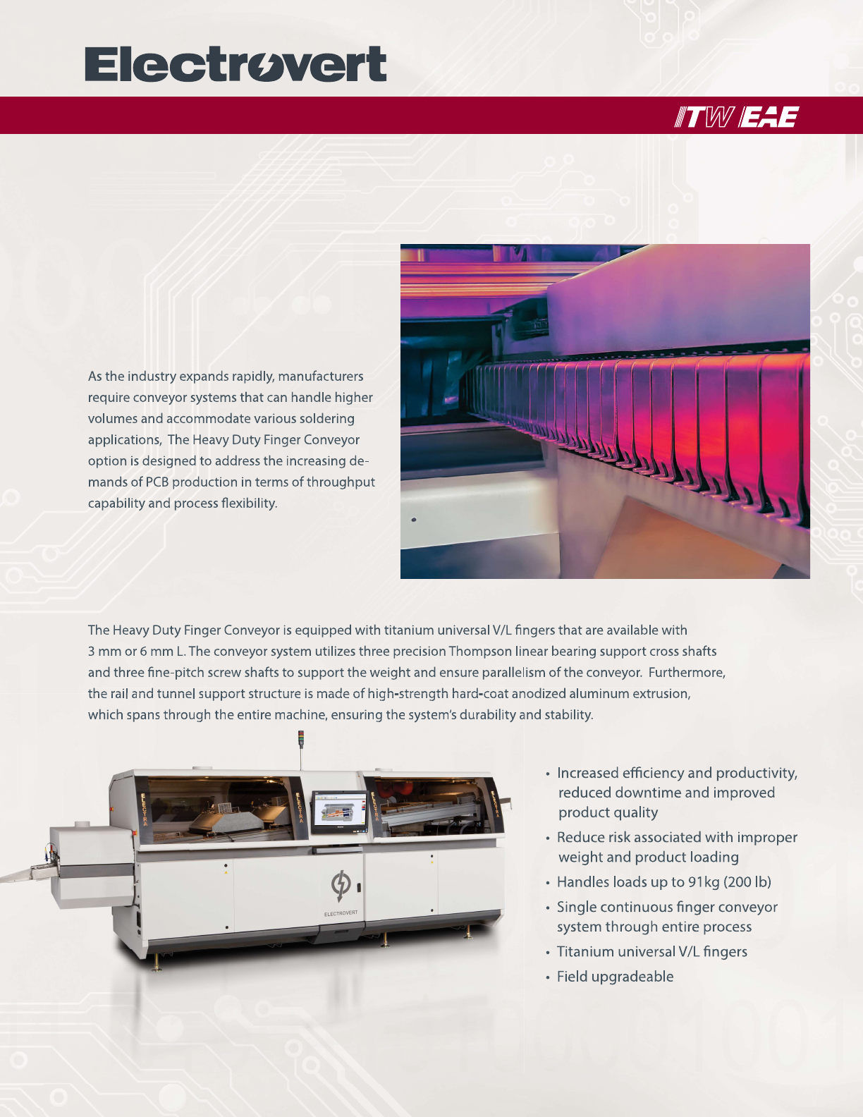 Increase line throughpu t without sac ri cing yields! Heavy Du t y Conveyor Electroni c Assemb ly E quip ment Key F eatures and Bene ts: Elec trov er t’ s new Heavy Du ty Conve yor can handle loa ds up to 91 kg (200 lb…