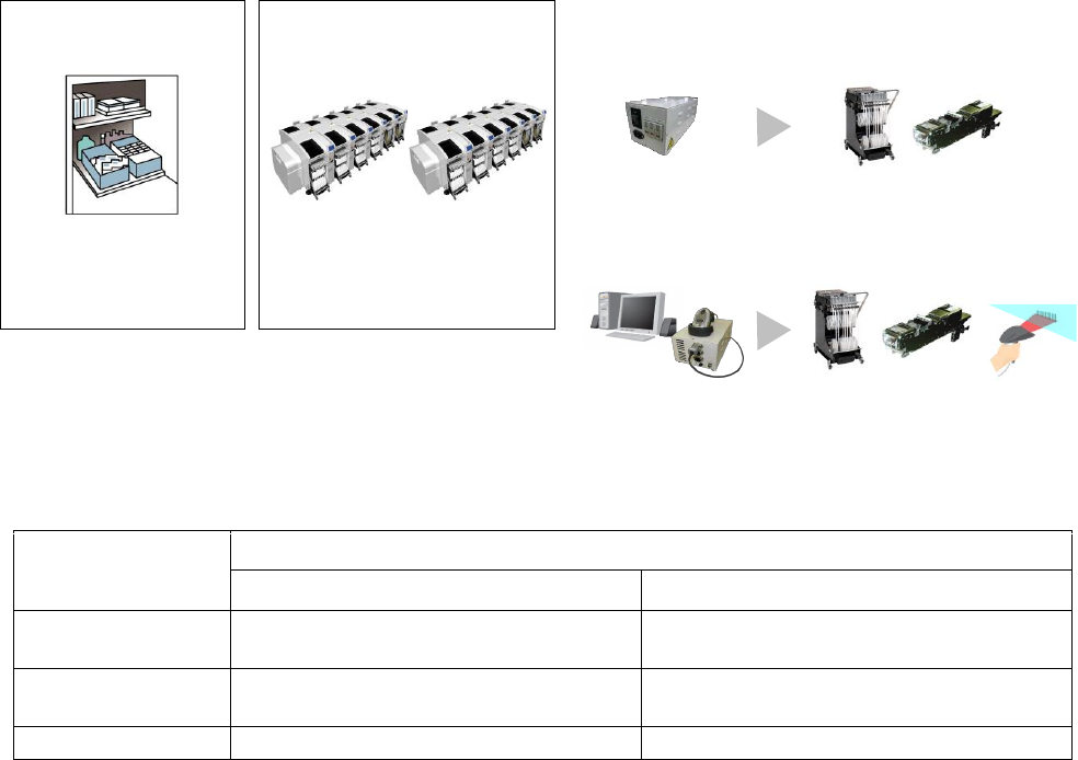使用客户持有的预备交换台车/ C-Cart 和供料器,在生产中可以进行下一机种的准备,大幅度减少机种切换的损失