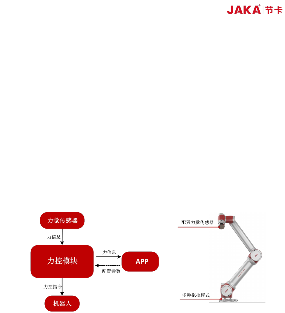 JAKA Zu Se 5 第 2 章 产品描述 JAKA Zu se 系统包含 AP P 、 机器人、 控制 柜和力觉传感 器设备。 如图 2 所示, 力觉传感器 和机器 人末端法兰 通过机械连 接。软件上的 操作通过节 卡小助 AP P 中的力传感 器模块来实现 ,如图 3 所示。 图 2. JAKA Zu se 系统示意图 图 3. 力传感器模块 APP 设置界面