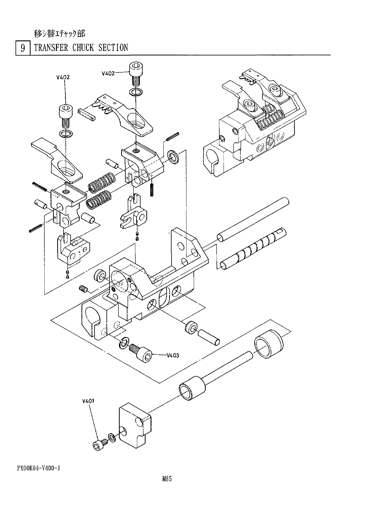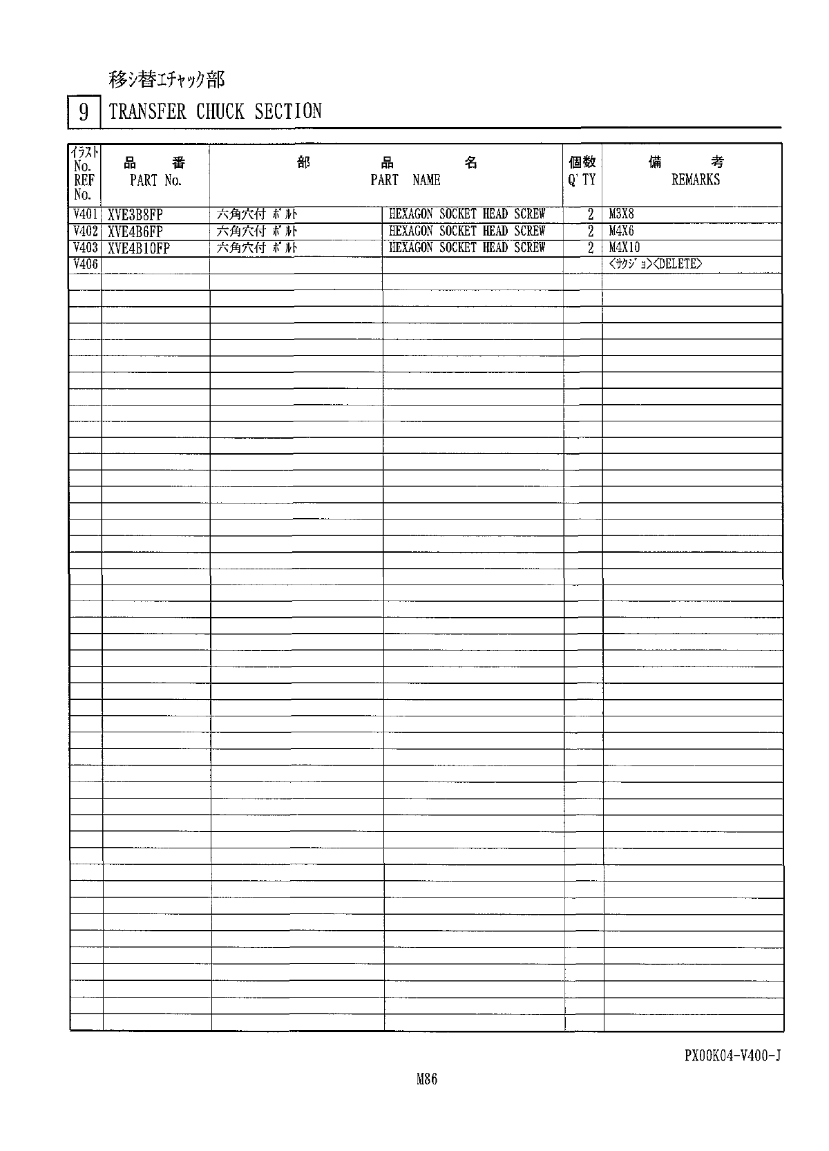 移 > 替 工 夕 部 9 l TRANSFER CHUCK SECTION 個 数 考 部 備 名 品 番 品 No . Q ' TY REMARKS m PART No . PART NAME No . V 40 I 六角穴付 HEXAGON SOCKET HEAD SCREW 1 M 3 X 8 XVE 3 B 8 FP 六 角 穴 付 扩 針 HEXAGON " SOCKET HEAD SCREW 2 …