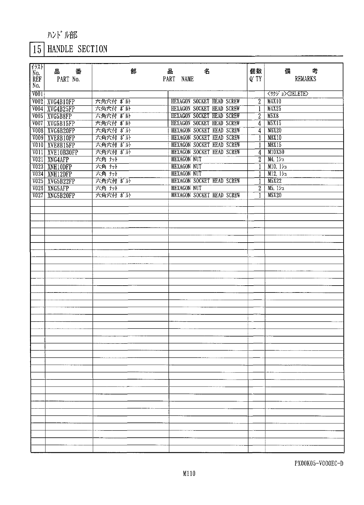 糾 鄕 l 5 l HANDLE SECTION im 個 数 考 部 備 名 品 品 番 No . Q , TY REMARKS PART NAME REF PART No . No . < W / aXDELETE ) V 001 六角穴付 HEXAGON SOCKET HEAD SCREW 2 M 4 X 10 V 002 XVG 4 B 10 FP 六角穴付 M 4 X 25 V 004 XVG 4 B 25 FP HEX…