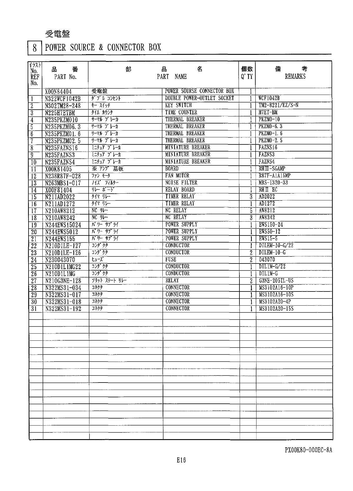受電盤 8 POWER SOURCE & CO 丽 ECTOR BOX 考 名 個 数 備 部 番 品 品 No . Q ' TY REMAMS PART NAME PART No . REF No . POWER SOURSE CONNECTOR BOX 受 電 盤 X 00 N 84404 DOUBLE POWER - OUTLET SOCKET r r jp TAy \ - WCF 1042 B N 322 WC…