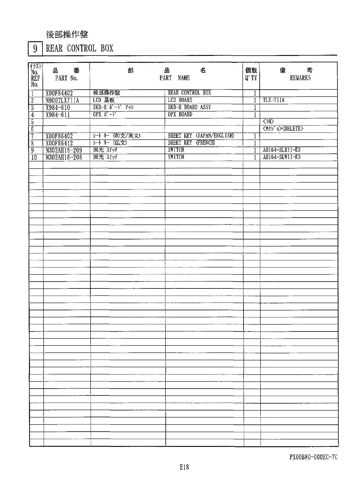 後部操作盤 9 l REAR CONTROL BOX 個 数 mv 考 備 部 名 番 品 品 No . REMARKS PART NAME Q ' TY REF PART No . No . 後部操作盤 REAR CONTROL BOX XOOF 84402 IcTW LCD BOARD TLX - 711 A 2 N 900 TLX 711 A SKB - R - K r - yv SKB - R BOAfiD ASSY …