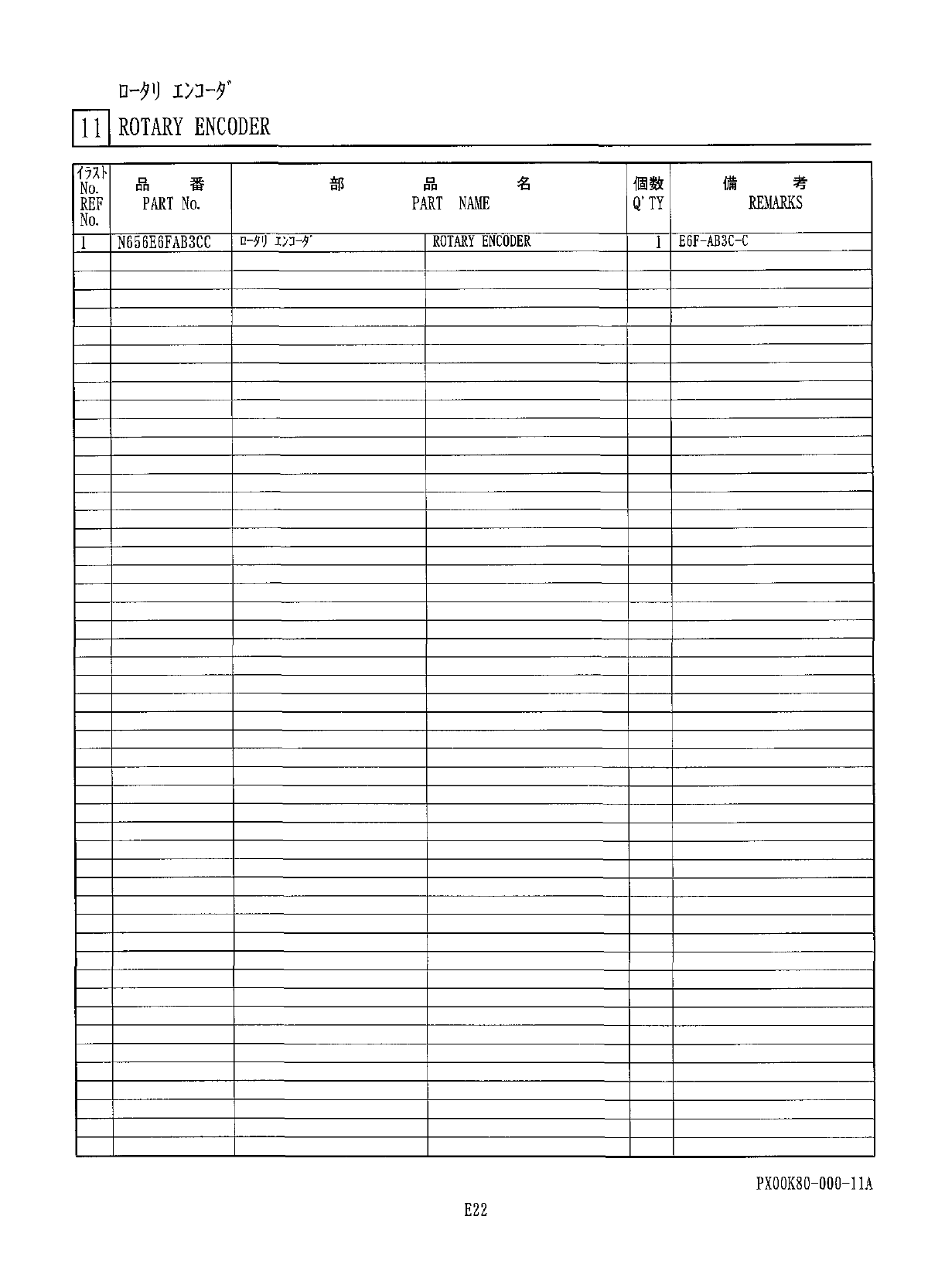 口 - 夕 IJ 工 > 3 - 夕 , TT 1 ROTARY ENCODER 考 備 部 名 個数 番 品 品 No . Q ’ TY REMARKS PART No . PART NAME REF No . D - 夕 ij 工 - 夕 . ROTARY ENCODER E 6 F - AB 3 C - C N 656 E 6 FAB 3 CC PX 00 K 80 - 000 - 11 A E 22