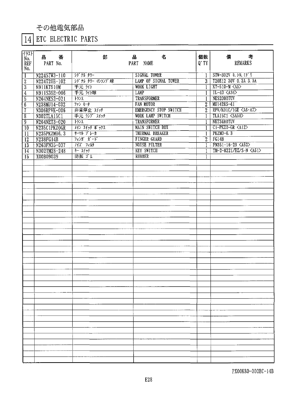 子 CO 他電気部品 14 ETC ELECTRIC PARTS 考 個 数 備 部 名 番 品 品 No . REMARKS PART NAME Q ’ TY PART No . REF No . SIGNAL TOWER STW - 302 V ^ yo , SK > J WWW N 224 STW 3 - 110 W n n - ( Dv ' yT M T 20 E 12 30 V 0 . 3 A 3 . 3 A …