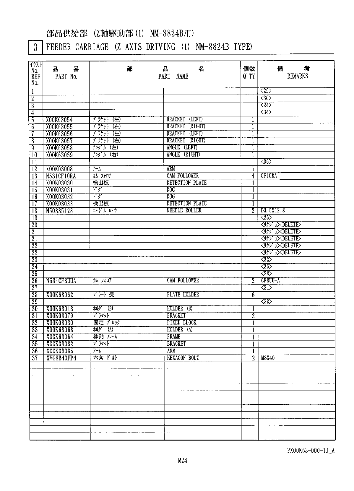 部品供給部 ( Z 軸駆動部 ⑴ NM - 8824 B 用 ) 3 ~ | FEEDER CARRIAGE ( Z - AXIS DRIVING ⑴ NM - 8824 B TYPE ) 懷 考 個数 備 部 名 番 品 品 No . Q ' TY REMARKS PART NAME PART No . REF No . < 29 > W 2 W I W T 7 分 , 卜 ( 左 ) BRACKET ( LEF…
