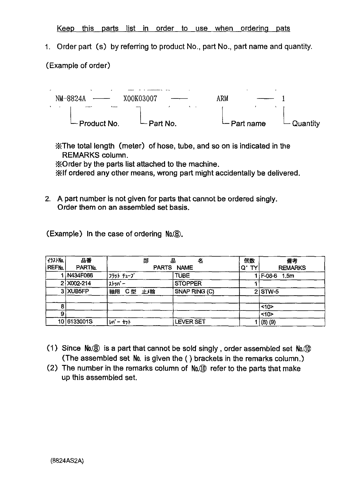 Keep this parts list in order to when ordering pats use 1 . Order part ( s ) by referring to product No . , part No . , part name and quantity . ( Example of order ) NM - 8824 A X 00 K 03007 ARM Product No . Part No . Qu…