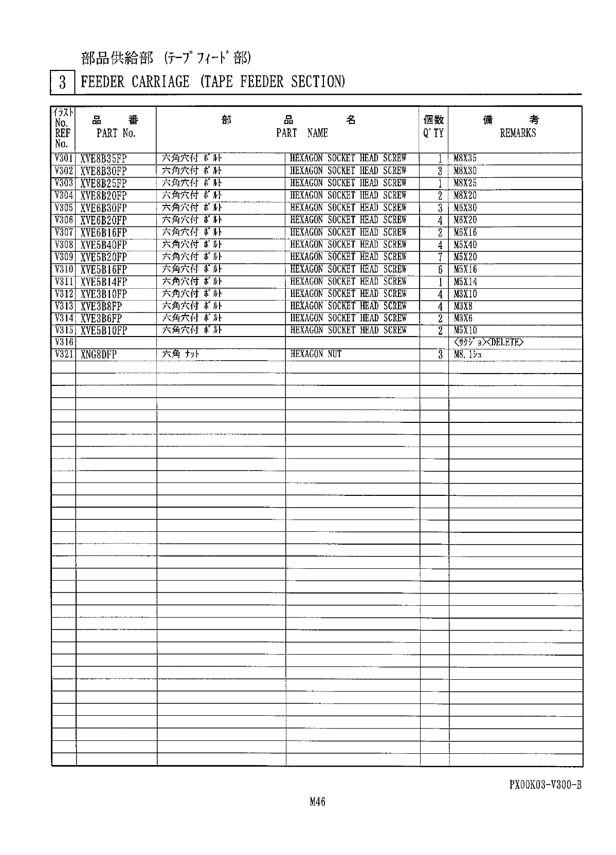 部 品 供 給 部 ( f ~ 7 ° 7 彳 - K ' 部 ) 31 FEEDER CARRIAGE ( TAPE FEEDER SECTION ) 考 部 名 個 数 備 番 品 品 No . PART NAME Q , TY REMARKS REF PART No . No . 六 角 穴 付 VM HEXAGON SOCKET HEAD SCREW V 301 XVE 8 B 35 FP M 8 X 35 六 角 穴…