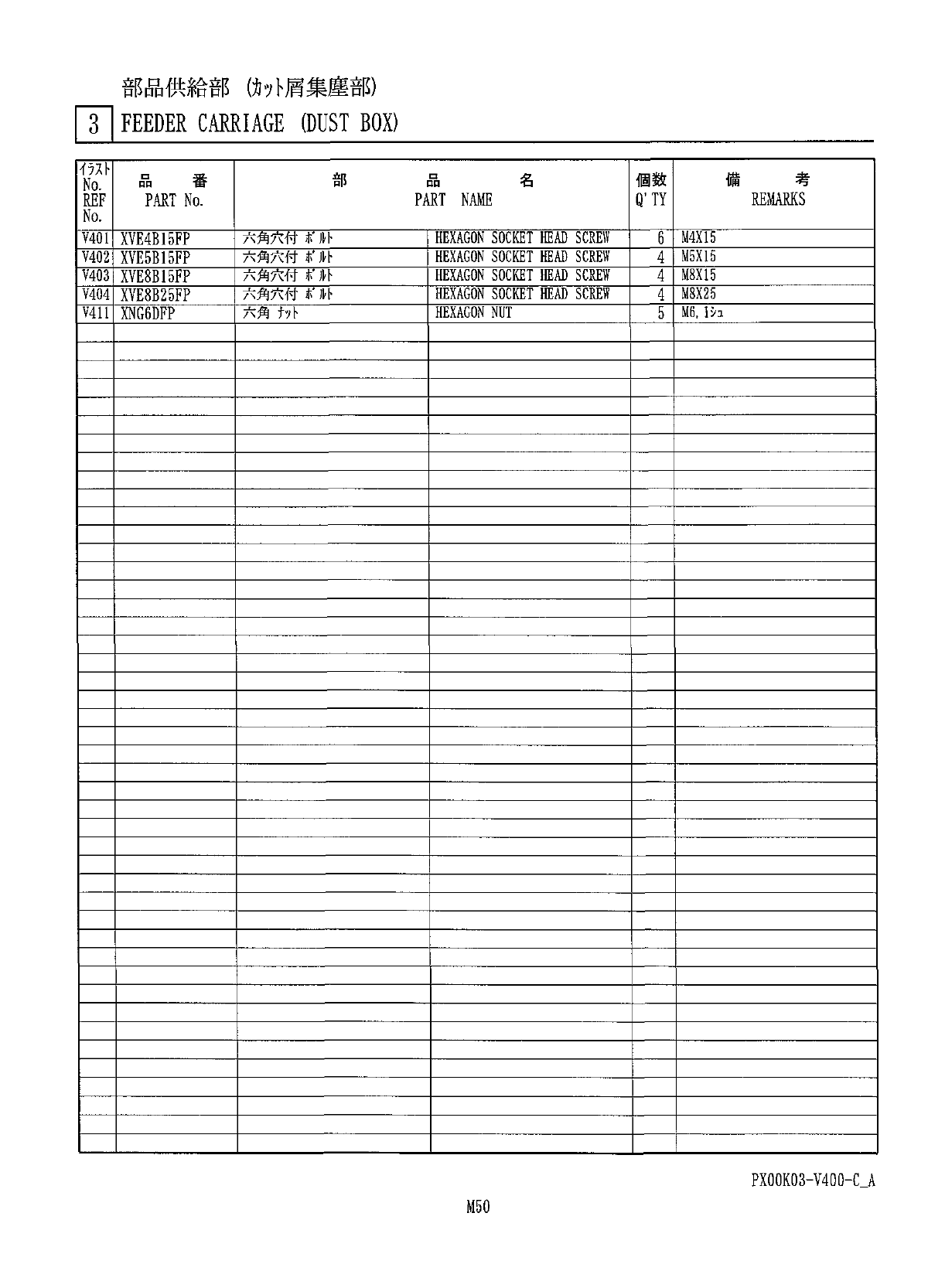 部品供給部 ( 力分屑集塵部 ) J ] FEEDER CARRIAGE { DUST BOX ) PX 00 K 03 - V 400 - C _ A