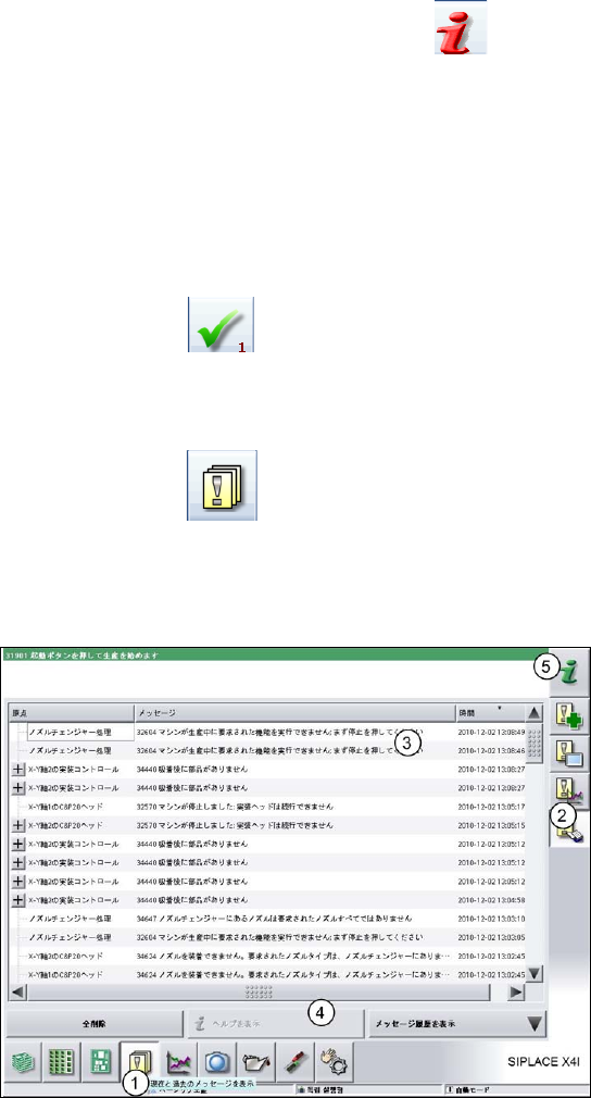 ユーザーマニュアル SIPLACE X シリーズ 5 3 マシンでの作業 ソフトウエアバージョン SR.70x.xx 以降 201 1 年 1 月日本語版 5.6 エ ラー情報およびオン ラインヘルプ 313 5.6.1 現在のエラーに関する情報の表示 現在のエラーに関する情報を表 示するには、 シンボルをクリックして 、ステーションコ ンピュータの ヘルプシステム を 開きます。エラー情報のあるメインの ヘルプシステム ウィンド ウが…