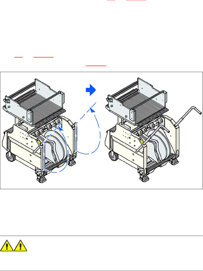 → フィーダが完全装備の部品トロリーは、20 度以上の傾斜で、横方向、または前方向に倒れ