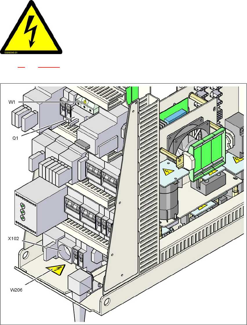 図 2.2 - 6 サービスソケット X102 の警告ラベル W206 およびメイン電源スイッチ Q1 の W1