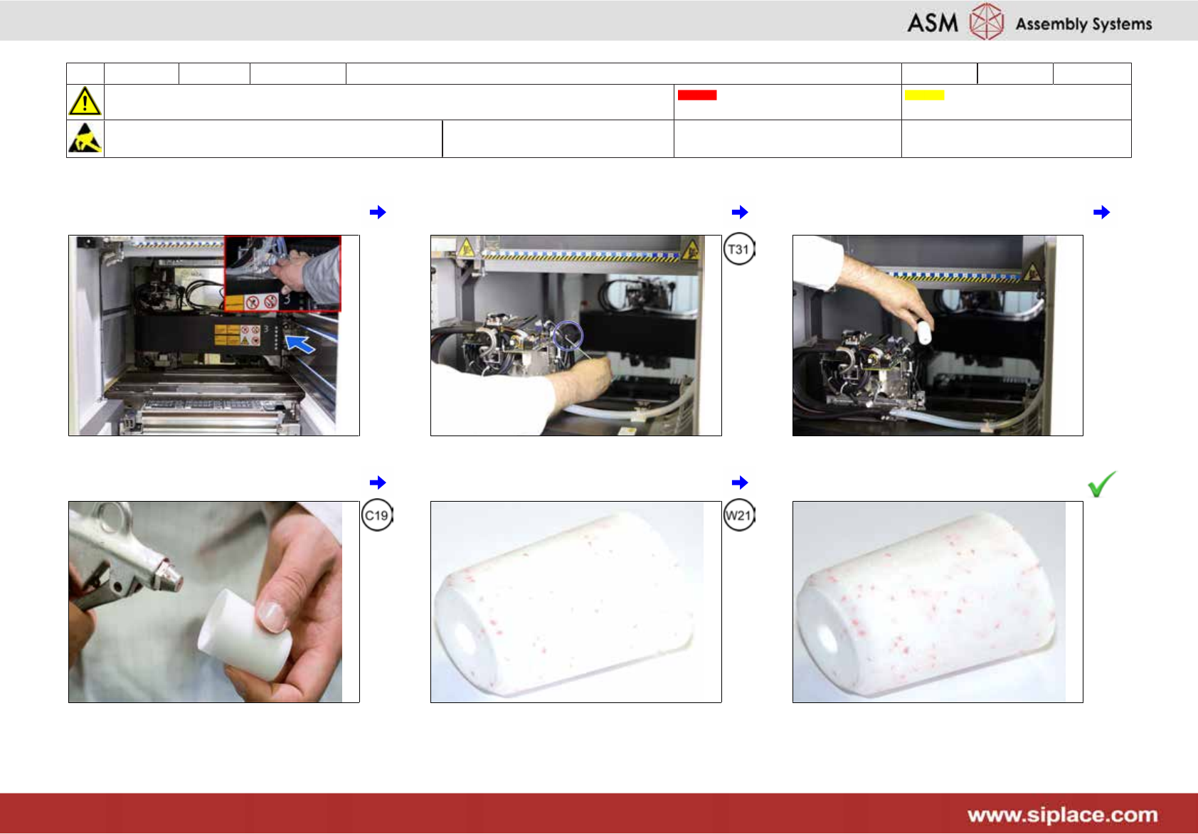10 每六个月 X_系列_S 底座 **/********* 5分钟 1/2 注意开始维护前,请参阅用户手册中的安全说明 贴片机状态 关闭 传送系统空 注意!遵守防静电守则 工具: T31 易损件: W21 耗材: C19 1 将 4 号和 2 号料台上的悬臂移到极限位 上 2 拧松 1 号和 3 号悬臂的螺丝 3 取出滤芯 4 将灰尘吹出 5 检查其是否干净 6 如正常,转至第 8 步