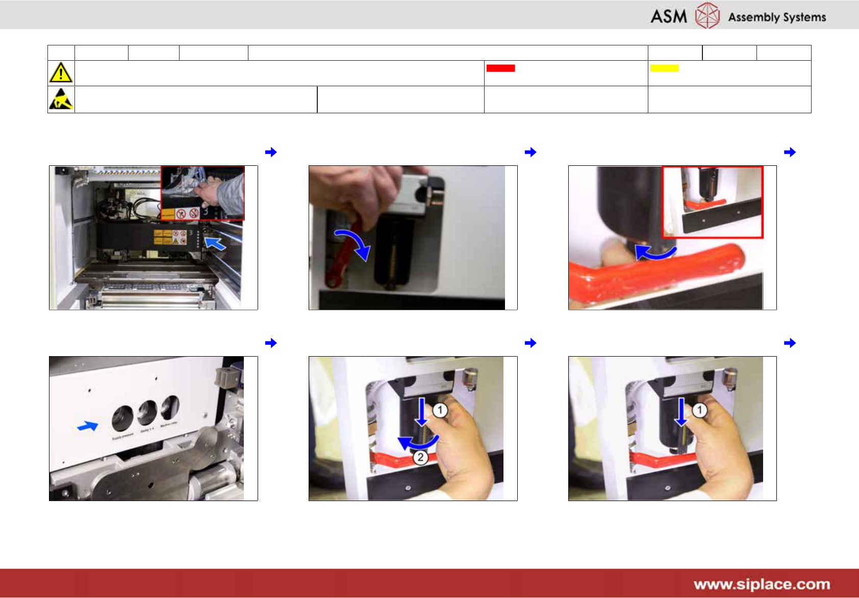 10 每六个月 X_系列_S 底座 **/********* 5分钟 2/2 注意开始维护前,请参阅用户手册中的安全说明 贴片机状态 关闭 传送系统空 注意!遵守防静电守则 工具: T31 易损件: W21 耗材: C19 7 如不正常,则请更换一个新滤芯 8 替换滤芯 9 固定螺钉 10 将 1 号和 3 号料台上的悬臂移到极限位 上 11 在 2 号和 4 号悬臂处重复步骤 2 到 9