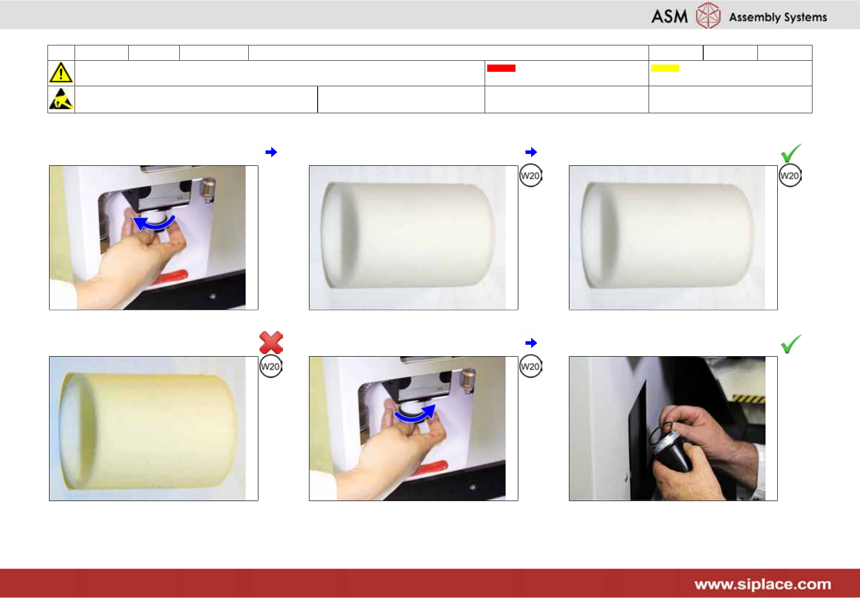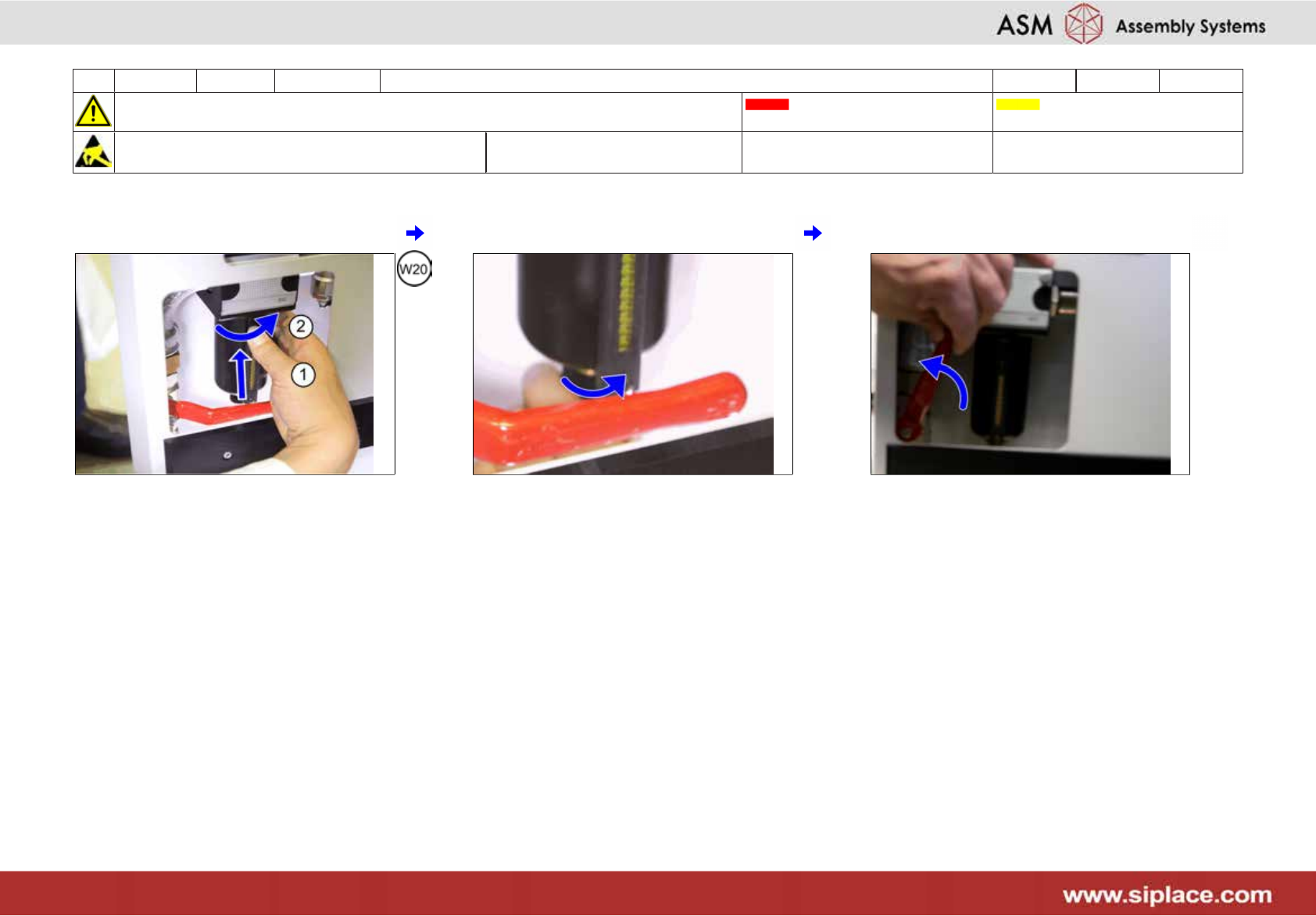 11 每六个月 X_系列_S 悬臂 **/******** 2 分钟 3/3 注意开始维护前,请参阅用户手册中的安全说明 贴片机状态 关闭 传送系统空 注意!遵守防静电守则 工具: 易损件: W20 耗材: 13 安放保护帽 (1),并在拧紧后关闭 (2) 14 如有螺母,请将其合上 15 打开控制杆