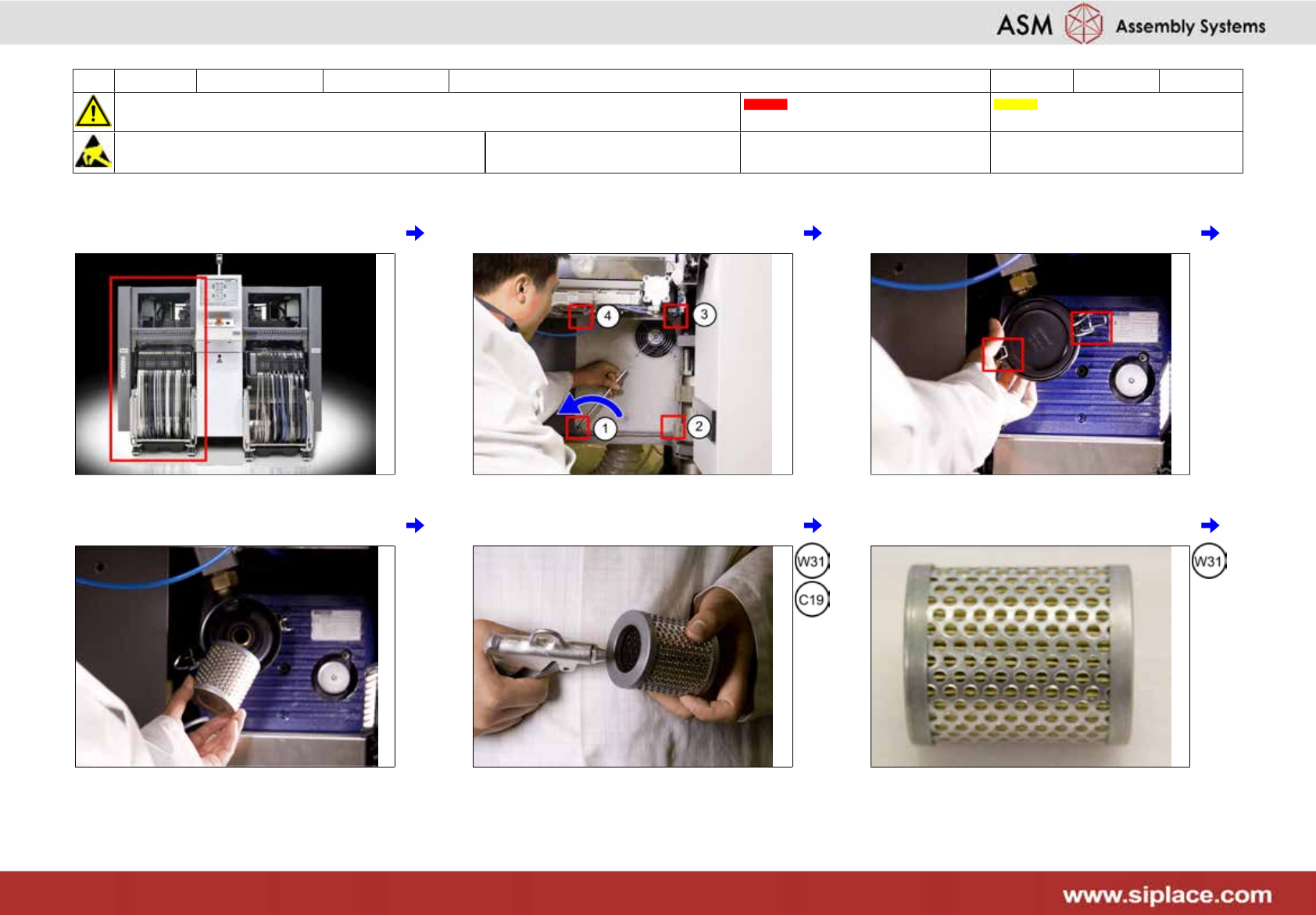 13 每六个月 X_系列_S 真空泵 **/******** 6 分钟 y 1/3 注意开始维护前,请参阅用户手册中的安全说明 贴片机状态 关闭 传送系统空 注意!遵守防静电守则 工具: T31 易损件: W31 耗材: C19 1 真空泵位于更换区域 1 处 2 拧开螺丝 (1) 至 (4) 3 打开边缘固定夹 (1) 并拆下盖子 4 拆卸真空过滤器 5 清洁真空过滤器 6 如正常,转至第 8 步