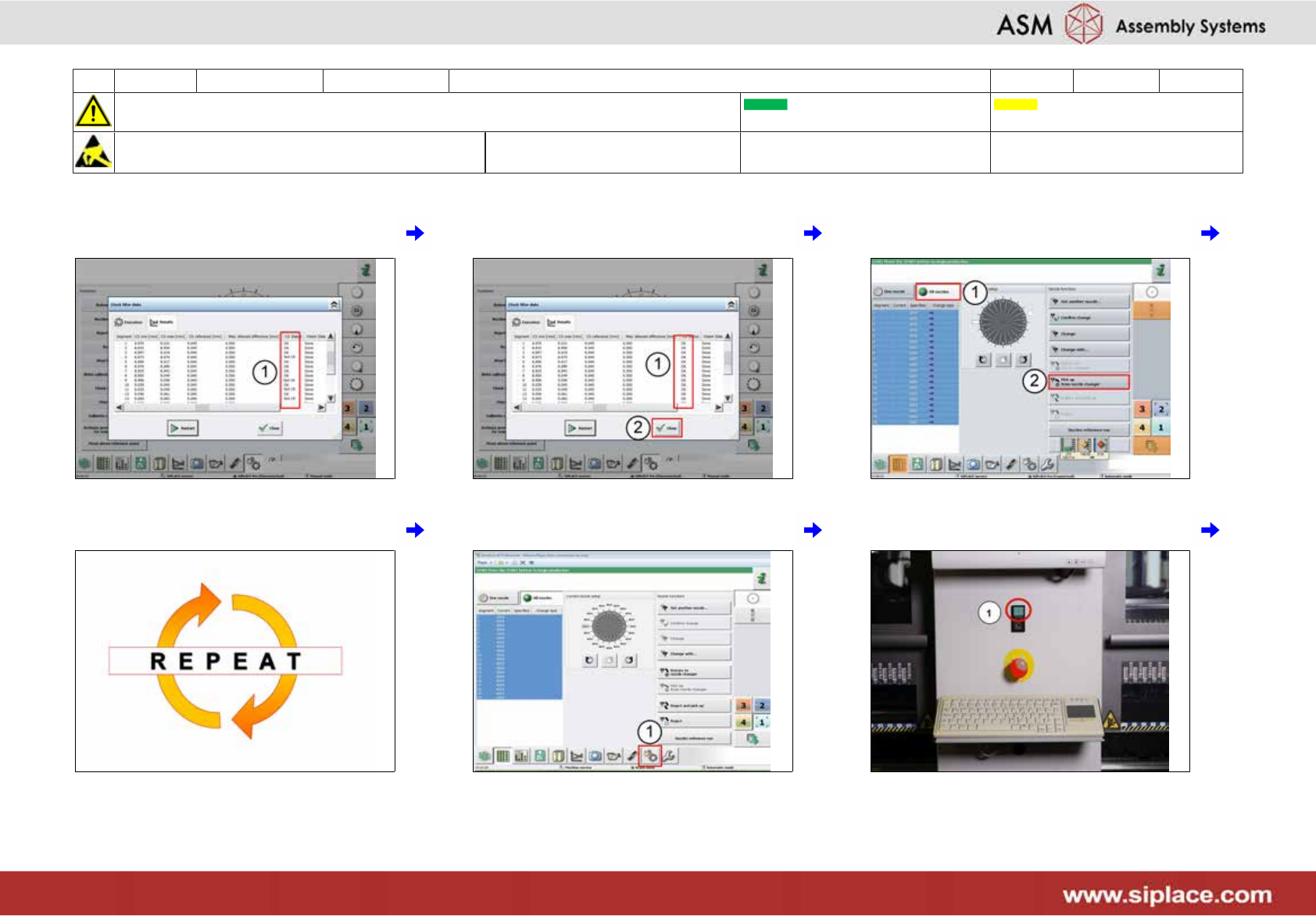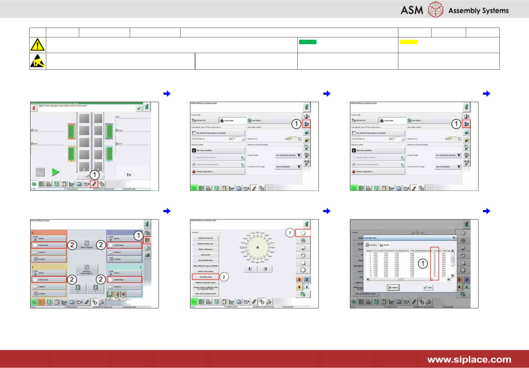 18 每 6 个月 X_系列_S 吸嘴 **********(C&P20P) 16 分钟 1/3 注意开始维护前,请参阅用户手册中的安全说明 贴片机状态开启 传送系统空 注意!遵守防静电守则 工具: 易损件: 耗材: 1 点击 (1) 2 点击 (1) 3 单击 (1),然后单击 (2) 4 单击 (1) 并从贴片头 (2) 中选择一个 5 单击 (1),然后单击 (2) 6 检查元件状态结果 (1)