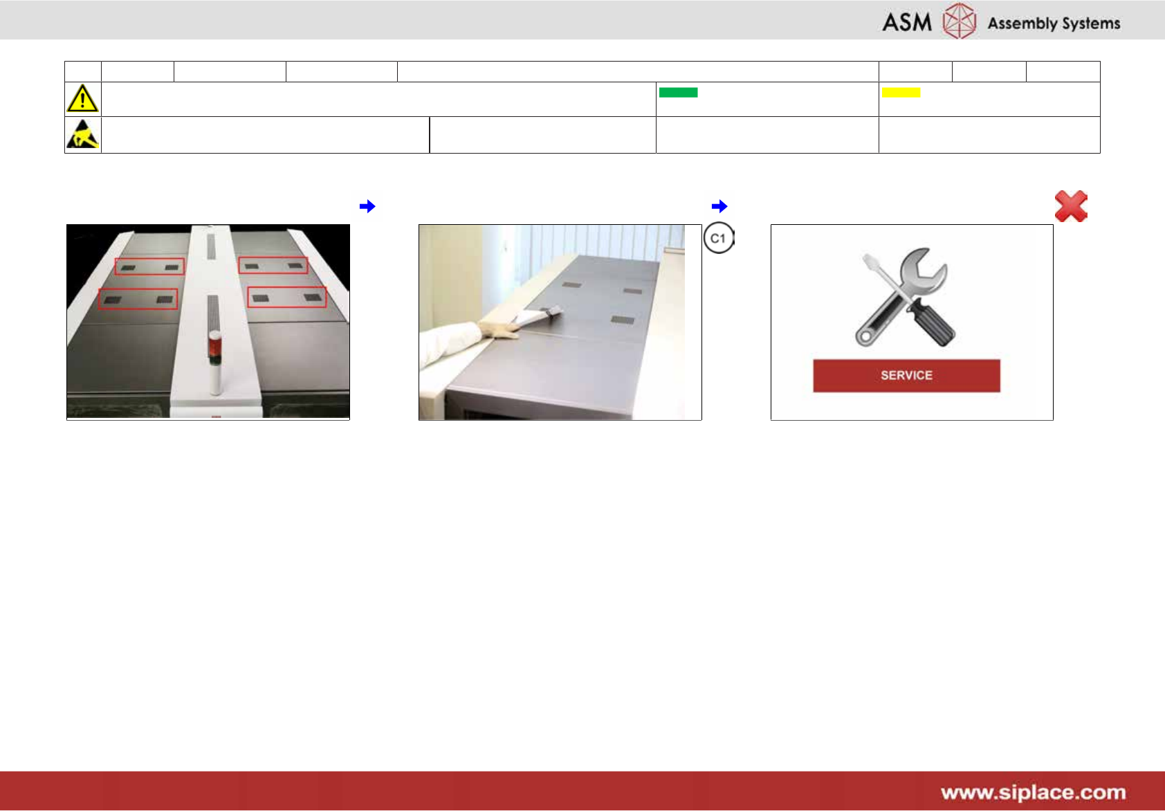 19 每六个月 X_系列_S 贴片头 ****** 5分钟 2/2 注意开始维护前,请参阅用户手册中的安全说明 贴片机状态开启 传送系统空 注意!遵守防静电守则 工具: 易损件: 耗材: 7 点击 (1) 8 点击 (1) 9 单击 (1),然后单击 (2)