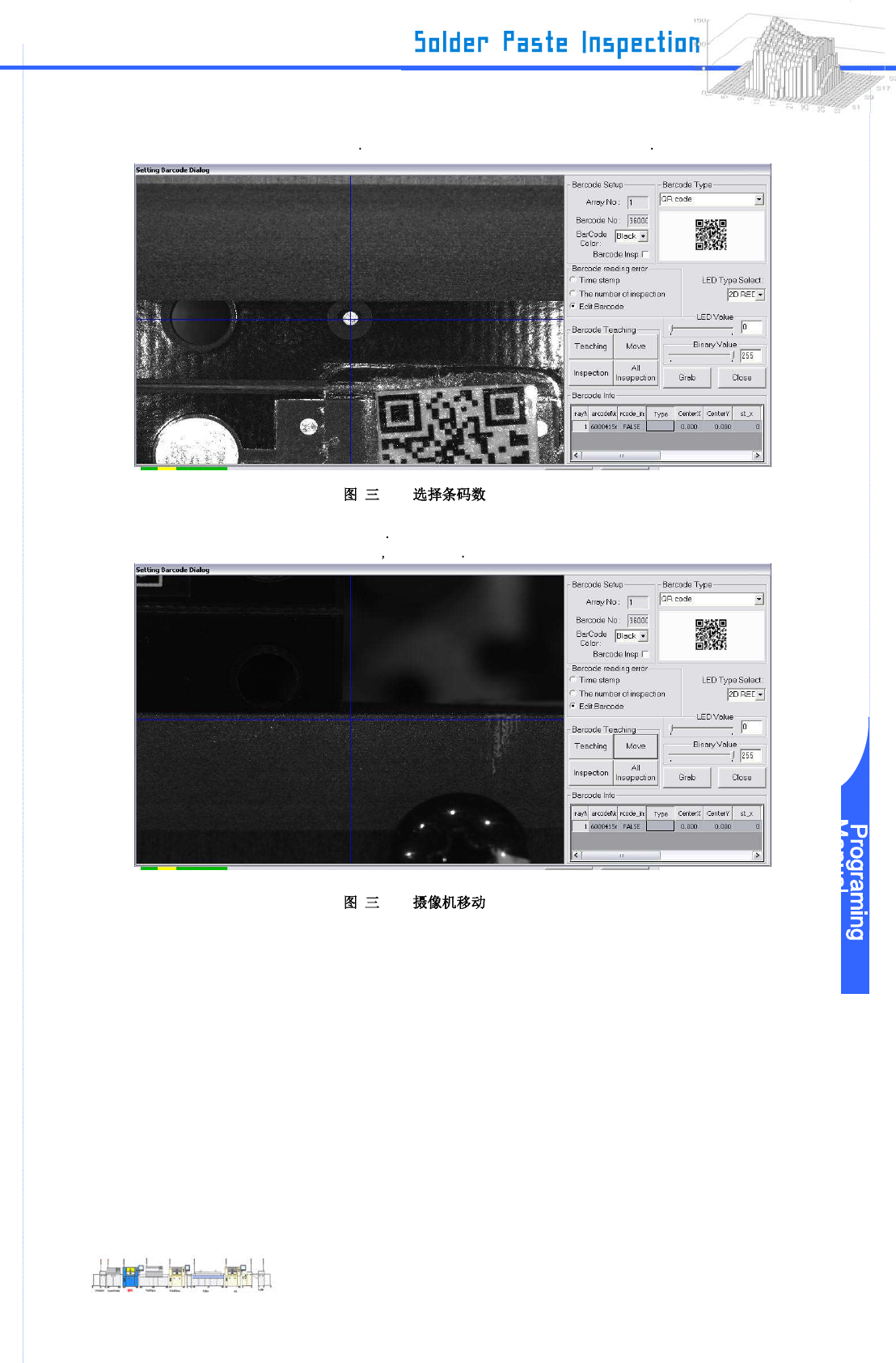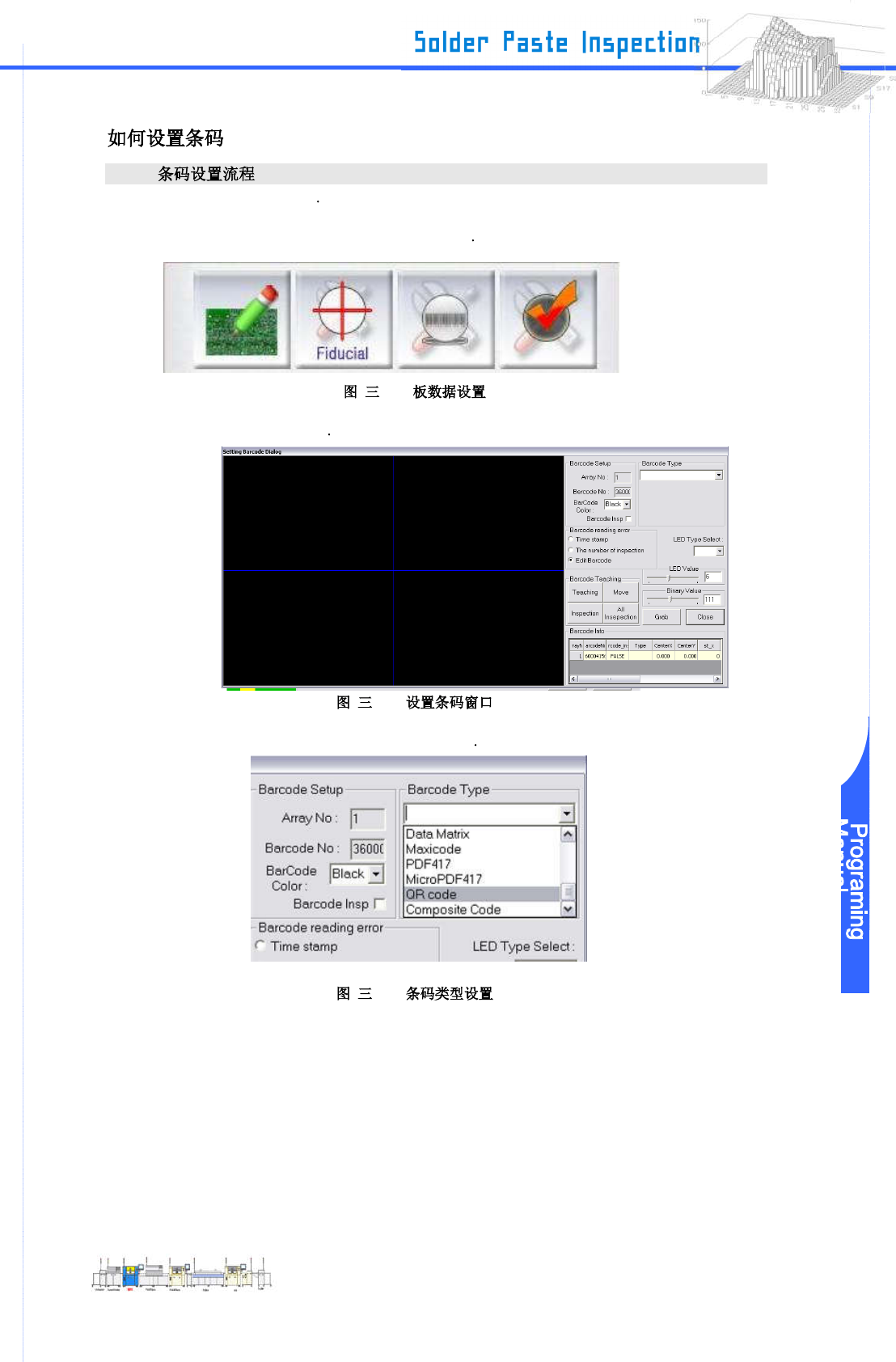 www .pemtron.com 45 III-7 III-7-1 本节说明如何操作条码读取设置 Step 1 : 从 “ Board Data ” 窗口选择 “ Set Barcode Mark ” -7-1 Step 2 : 条码读取设置对话框显示 -7-2 Step 3 : 从“ Barcode T ype ” 列表中选择要读取的条码 -7-3
