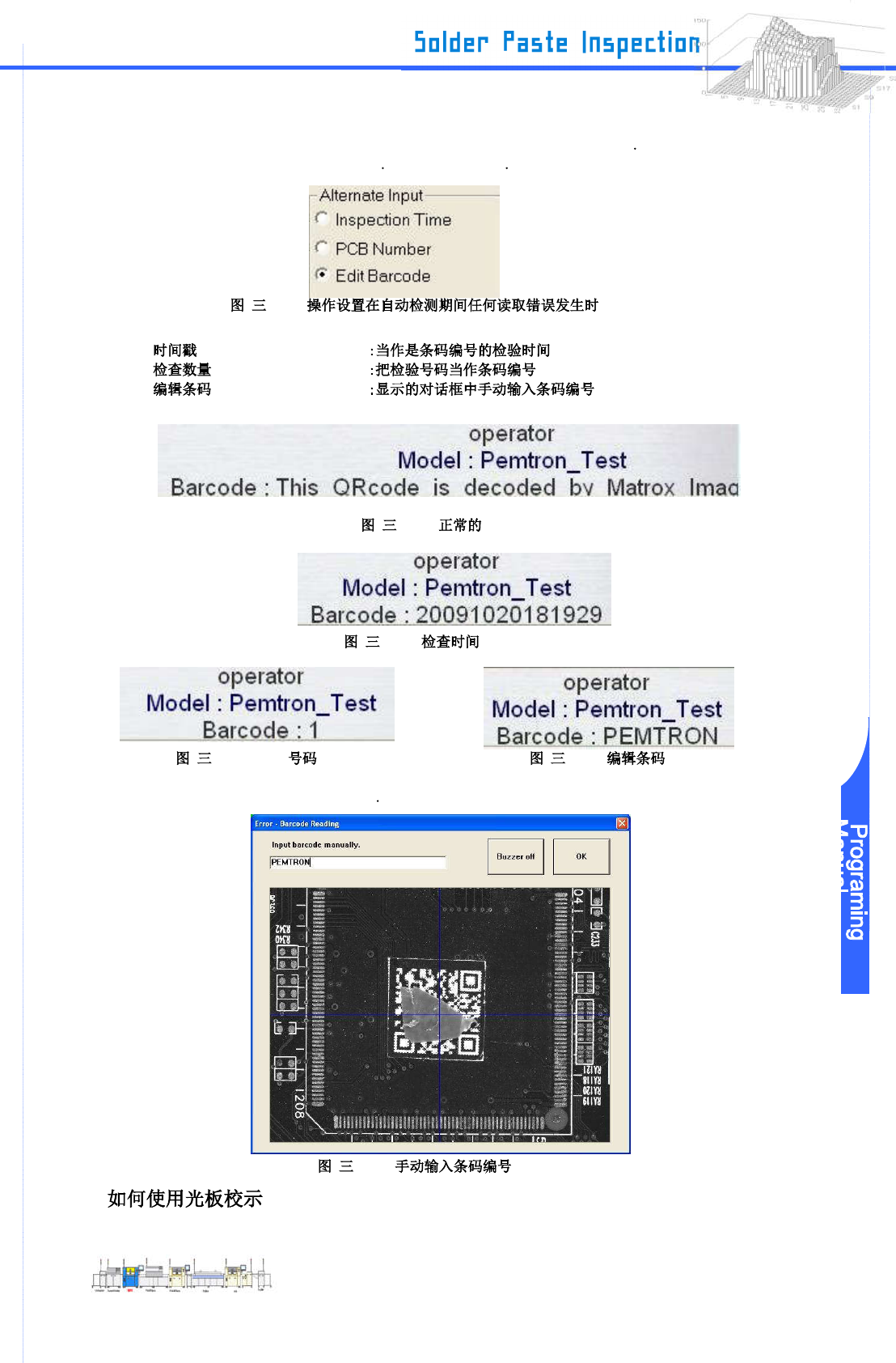www .pemtron.com 50 III-8-1 在这里 所说 的 是如何 从焊 盘 表面 量测 焊锡印 刷高 度 以 便进 行更精 确的 检查 从焊 盘表 面量 测表面 抵制 值 并指定偏移量作为修正值当执行检查时 Step 1 : 选择 Bare Setup 的“ T eac h ”在 Board Dat a 窗口 -8-1 Step 2 : Bare Board T eaching 菜单窗口显示 选择“ T each ” 8…