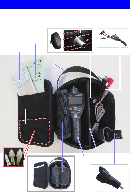 第 1 章 概要 16 关于携带盒内的存放 使用说明书 反光贴纸 周速环 触头× 3 请参阅下图进行存放。 转速计 输出线 接触式转换器 吊带 内盖 (粘扣带固定) 插袋 橡胶扎带 隔断