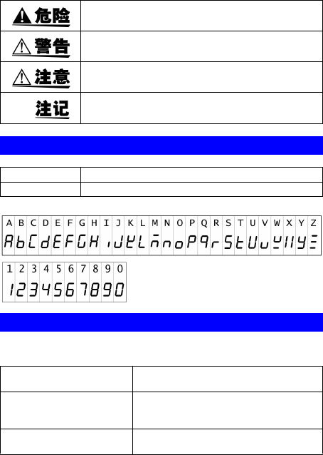 关于安全 3 使用说明书的注意事项,根据 重要程度有以下标记。 本仪器按如下所示标记画面显 示。 本公司将测量值的极限误差 ,作为如下所示的 f.s. (满量程) 、 rdg. (读 数) 、 dgt. (数位分辨率) 的值来加以定义。 表示如果产生操作或使用错误,有导致使用者死亡 或重伤的极高危险性。 表示如果产生操作或使用错误,有导致使用者死亡 或重伤的危险性。 表示如果产生操作或使用错误,有可能导致使用者 受伤或仪器损坏。 表示产…