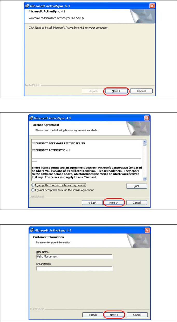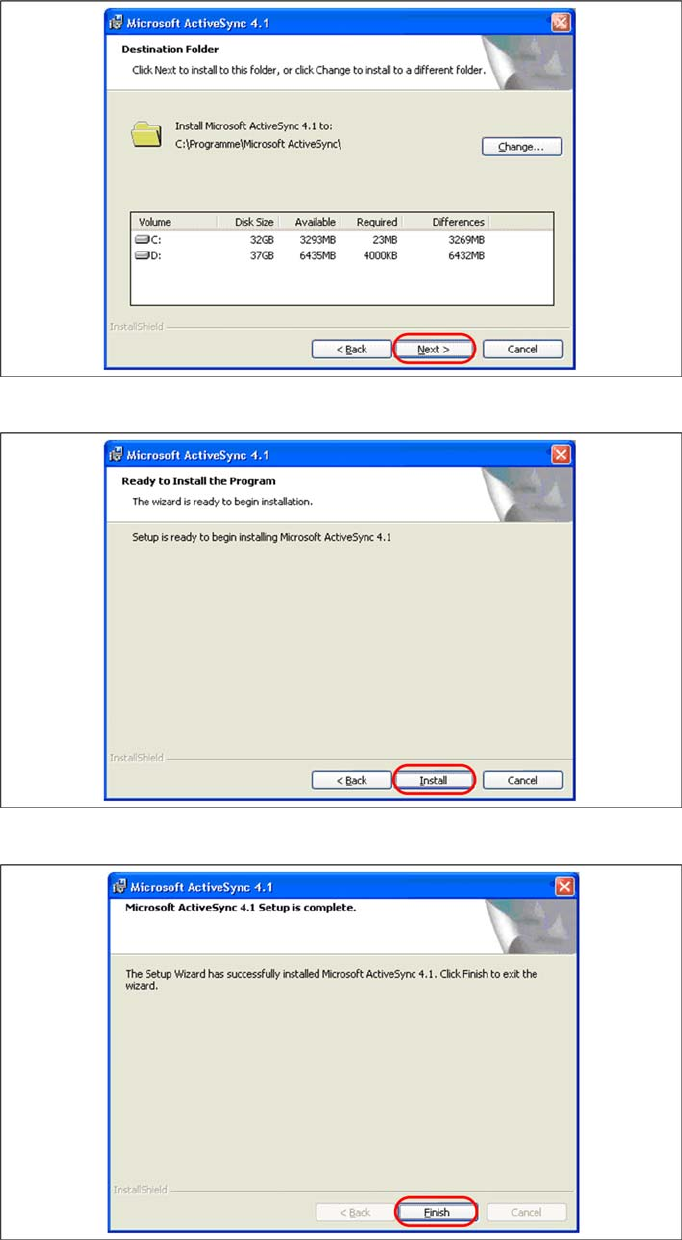 X Select "Install" to start with the installation of Microsoft ActiveSync.