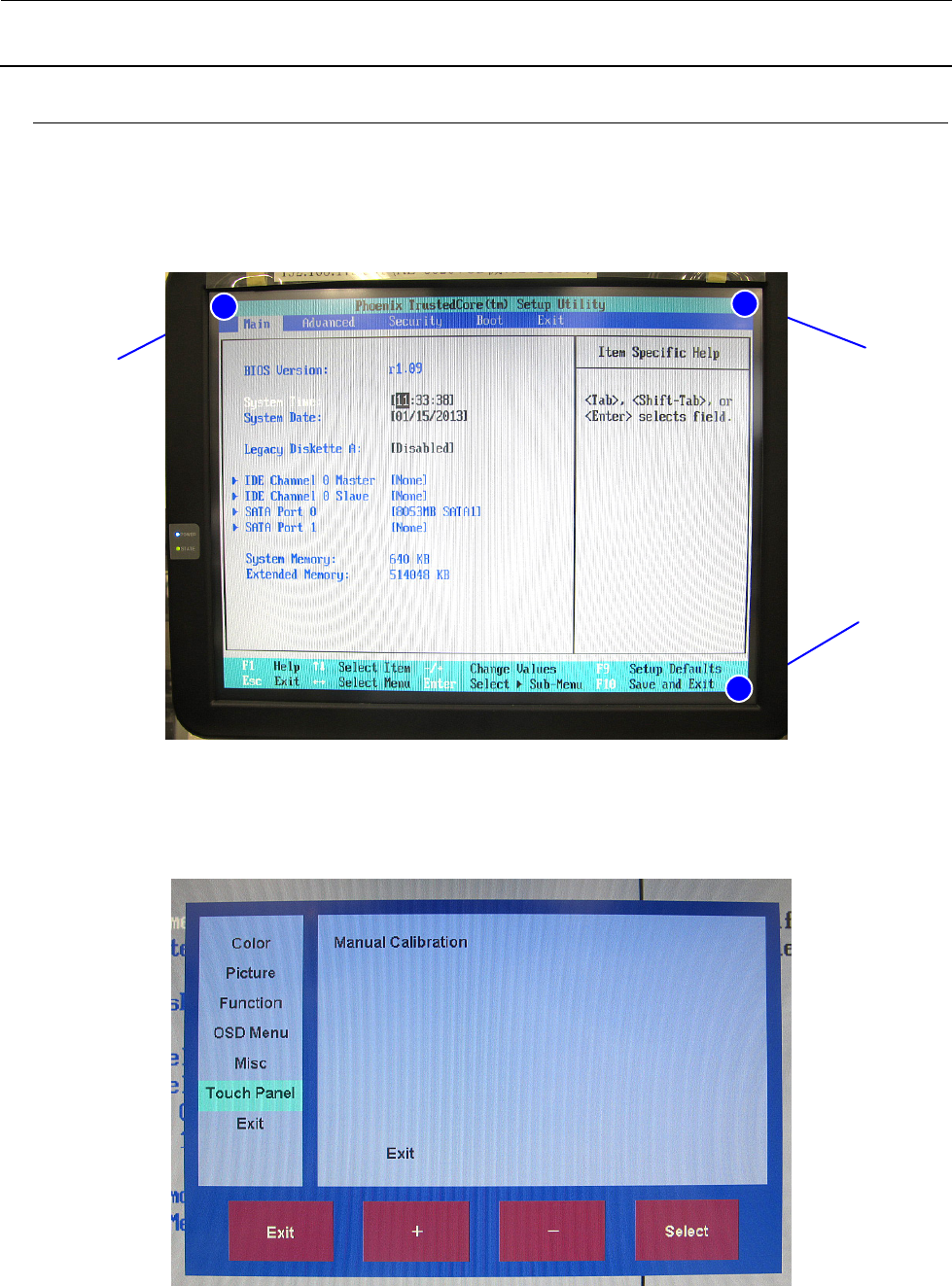维修调整要领书 13 -2 13 -1- 2 . 接触式面板的设置 更换 LCD 监视器后,必须进行接触式面板的设置。 1 ) 按照 ① 、 ② 、 ③ 的順序点触下图所示的 LC D 监视器的 3 个位置,使显示 OS D 。 2 ) 操作 OS D 的 “ + ” , “ - ” ,使光标移动至 “Touch Panel” 。 ① ② ③