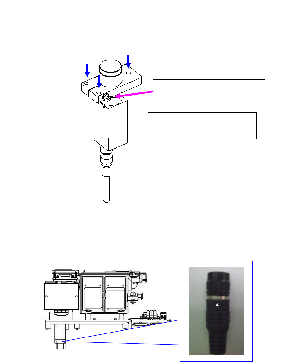 维修调整要领书 8-2 4 ) 卸下照明装置即会露出照相机,请拆下 M4×20 带垫片螺丝( SL6042092TN ) 3 个,卸下照相机。 图 8- 1-2 5 ) 用酒精等清洁摄像机的安装面。 6 ) 请按相反的顺序将新的摄像机和照明装置返回原处。 7) 插入照相机电缆时,正面看着连接器部的 △ 记号插入。 图 8- 1-3 40106751 : S- VCS ST 摄像机组件 40106752 : S- VCS OP 摄像机组件…