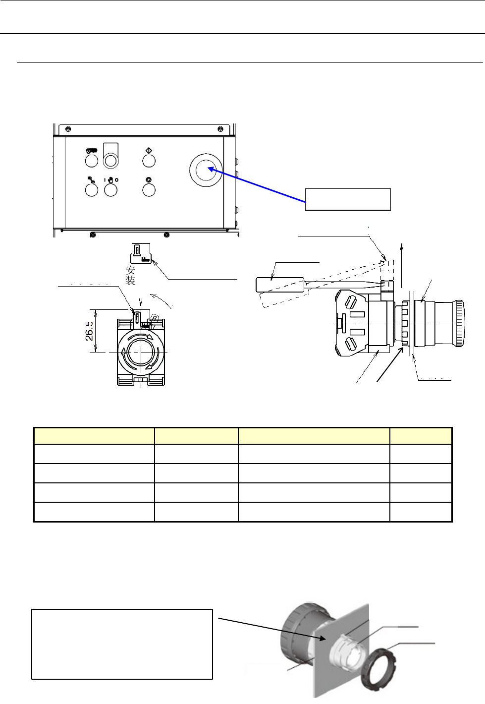 4) 安装方法:拆下锁定螺母,确认橡皮垫圈正常安装后,将操作部从面板前面穿过面板孔。 使操作