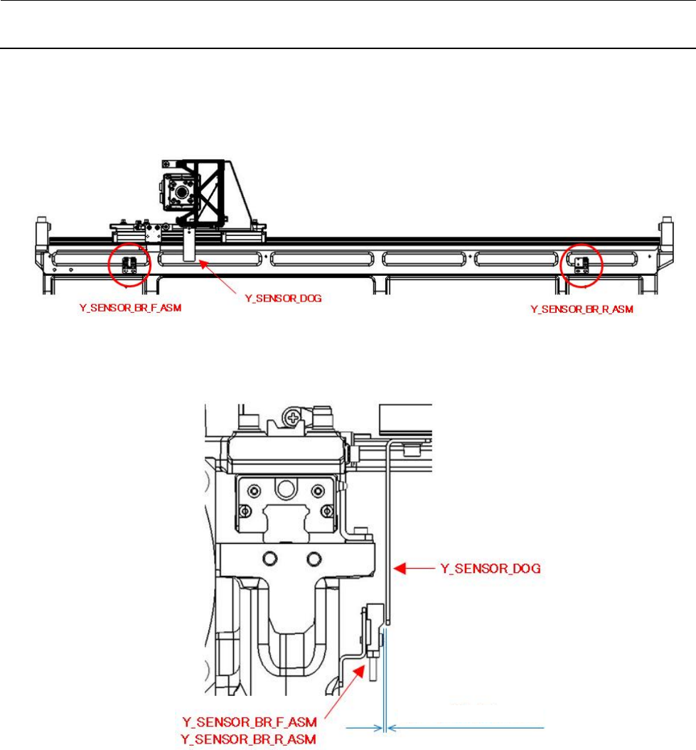 1) 松开 Y 极限传感器托架的止动螺丝进行调整,离开座架之开尾销安装中心位置的距离要成为下图