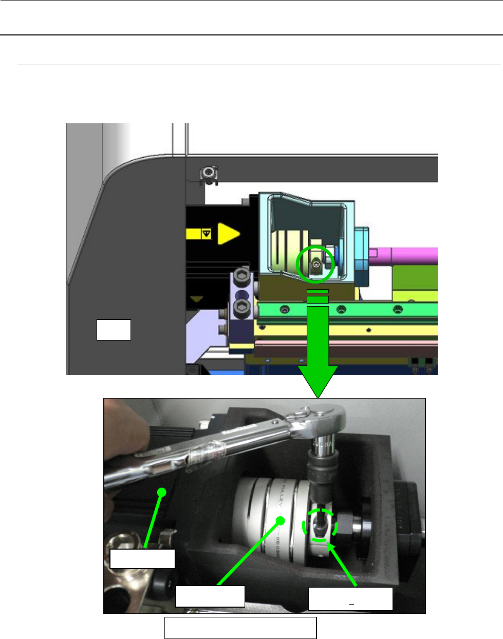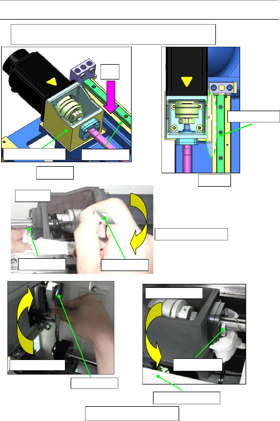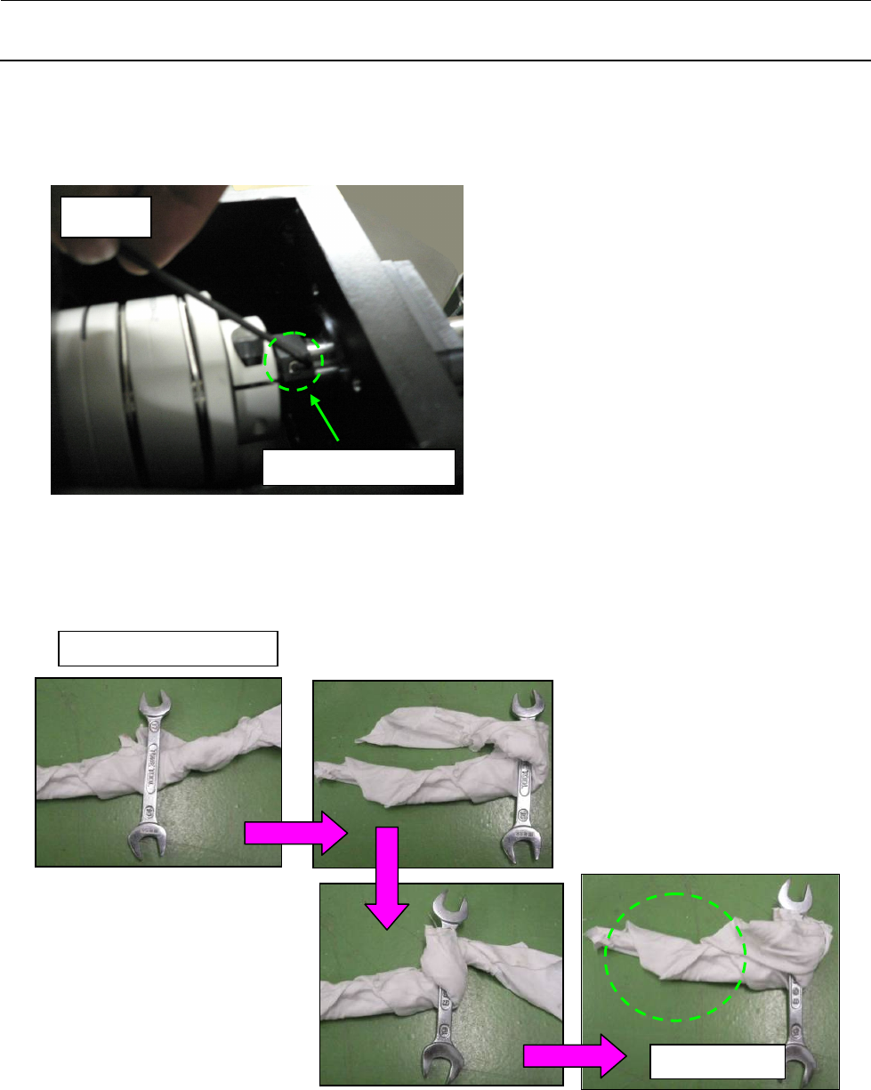 维修调整要领书 1- 53 ( 2 ) 松开锁紧螺母的止动螺丝,把 22 一头的 扳手嵌入锁紧螺母, 17 一头的扳手嵌入滚珠螺杆的槽内,松开锁紧螺母。 ※ 锁紧螺母的止动螺丝不要把头露出锁紧螺母的表面。 ( 3 ) 用回丝包住扳手 ※ 为了提高工作效率、保护机器,一定要这样做。 用回丝包住扳手的方法 放 入空隙 内。 锁紧螺母的止动螺丝 YR 前侧