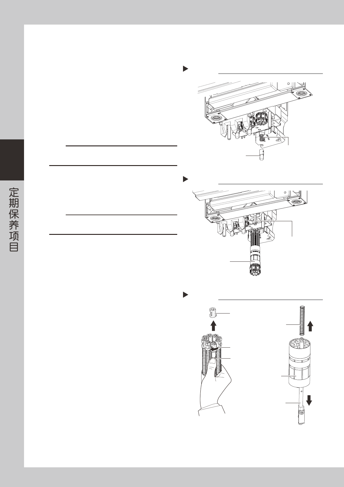 3-4 3 ■ HS 贴装头 更换 HS 贴装头的弹簧片,请按照下列操作步骤拆下转塔之后再进行。 配备吸嘴交换站时,请先使所有吸嘴被放回吸嘴交换站之后,再进行。 e 1 拆卸弹簧座。 1. 按下紧急停机按钮。 2. 如右图所示,边将弹簧座向上按边向右转动。 3. 拆下弹簧座与弹簧。 55357-N5-10 2 拆卸转塔。 从贴装头组件上拔下转塔。 55358-N5-10 c 注意 ‧ 拔下转塔时,请勿触碰侧面视觉相机等的照明。 ‧ …