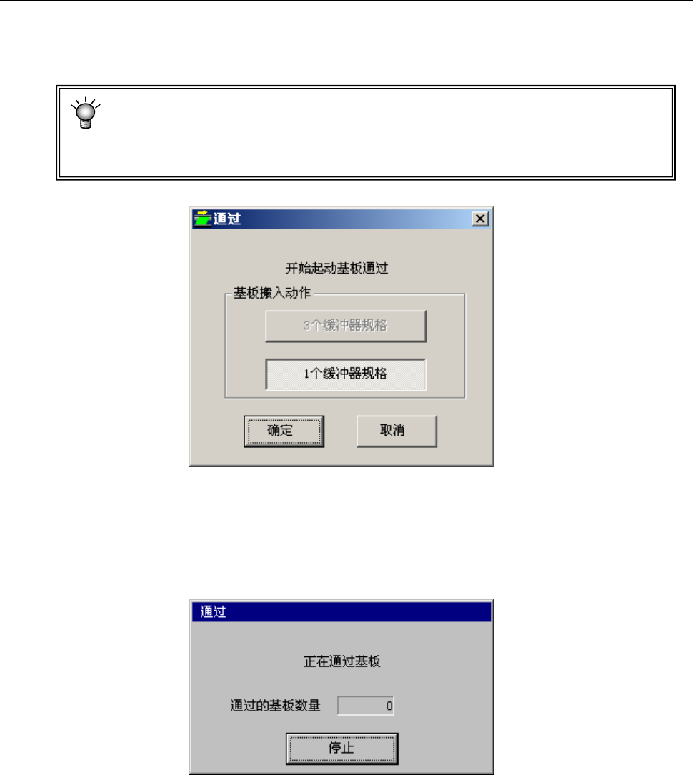 第 1 部 基本篇 第 2 章 生产 2-21 2-5 通过模式 不进行贴片,只让基板传送通过。 在主画面菜单栏中选择“维护”/“通过模式”后,会显示以下画面。 此时,虽然无需返回原点,但请按基板尺寸调整传送宽度。 即使设备有故障无法返回原点,有时也可实行通过模式。 在这种状况下, 为防止传感器的误检导致停止, 请把贴片头(Head)单元自动移到比传 送路线更靠内的一侧。(大约在校准块的上方) 图2-5-1 开始通过模式 使用3个缓冲器…