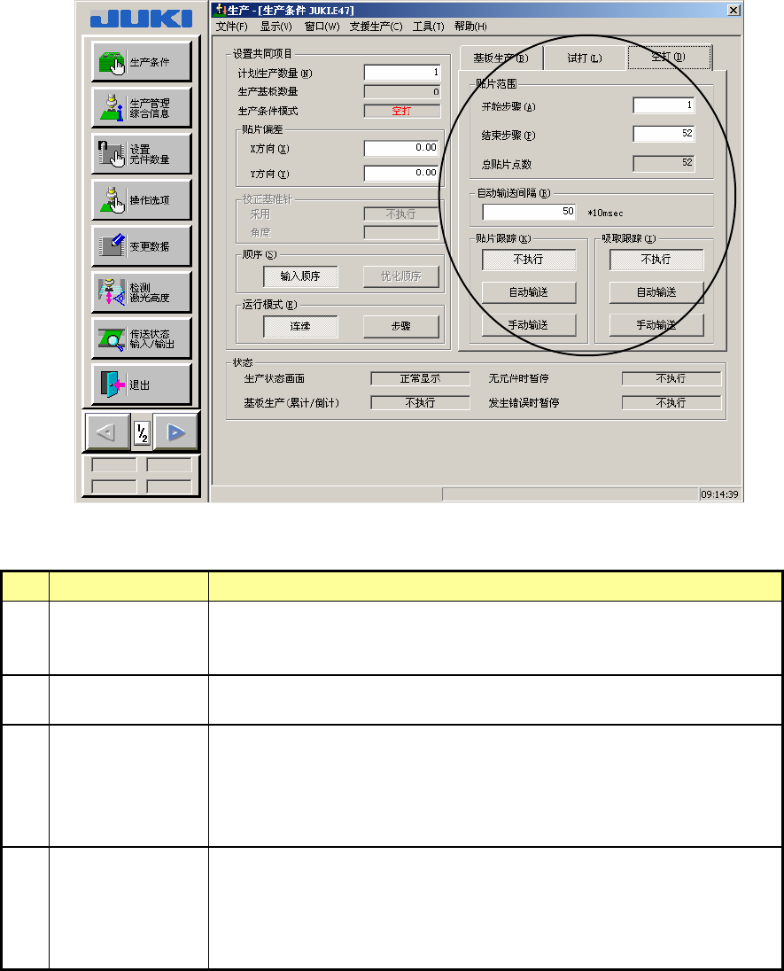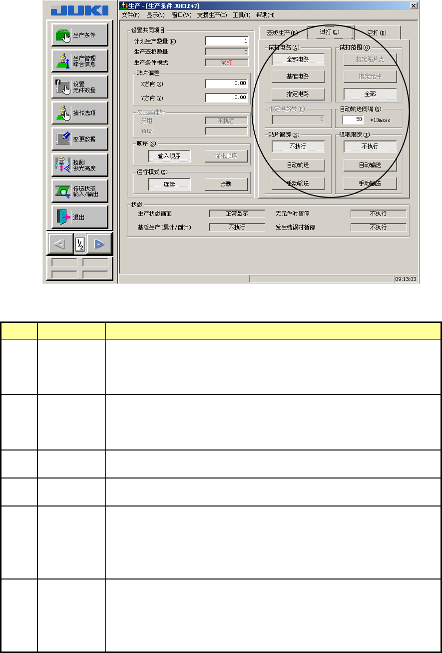 第 1 部 基本篇 第 2 章 生产 2-36 2) 试打 图2-8-2-2-1 试打条件的设定 No. 项目 内容□ 1 试打电路 设置试打的电路。单板基板时不使用。 ·全部电路:对全部电路试打范围中设置的元件进行贴片。 ·基准电路:对基准电路试打范围中设置的元件进行贴片。 ·指定电路:对指定的电路试打范围中设置的元件进行贴片。 2 试打范围 设置试打范围。 ·指定贴片点:仅对贴片数据的试打项设置为“进行”的贴片点。 ·指定元件:元件…