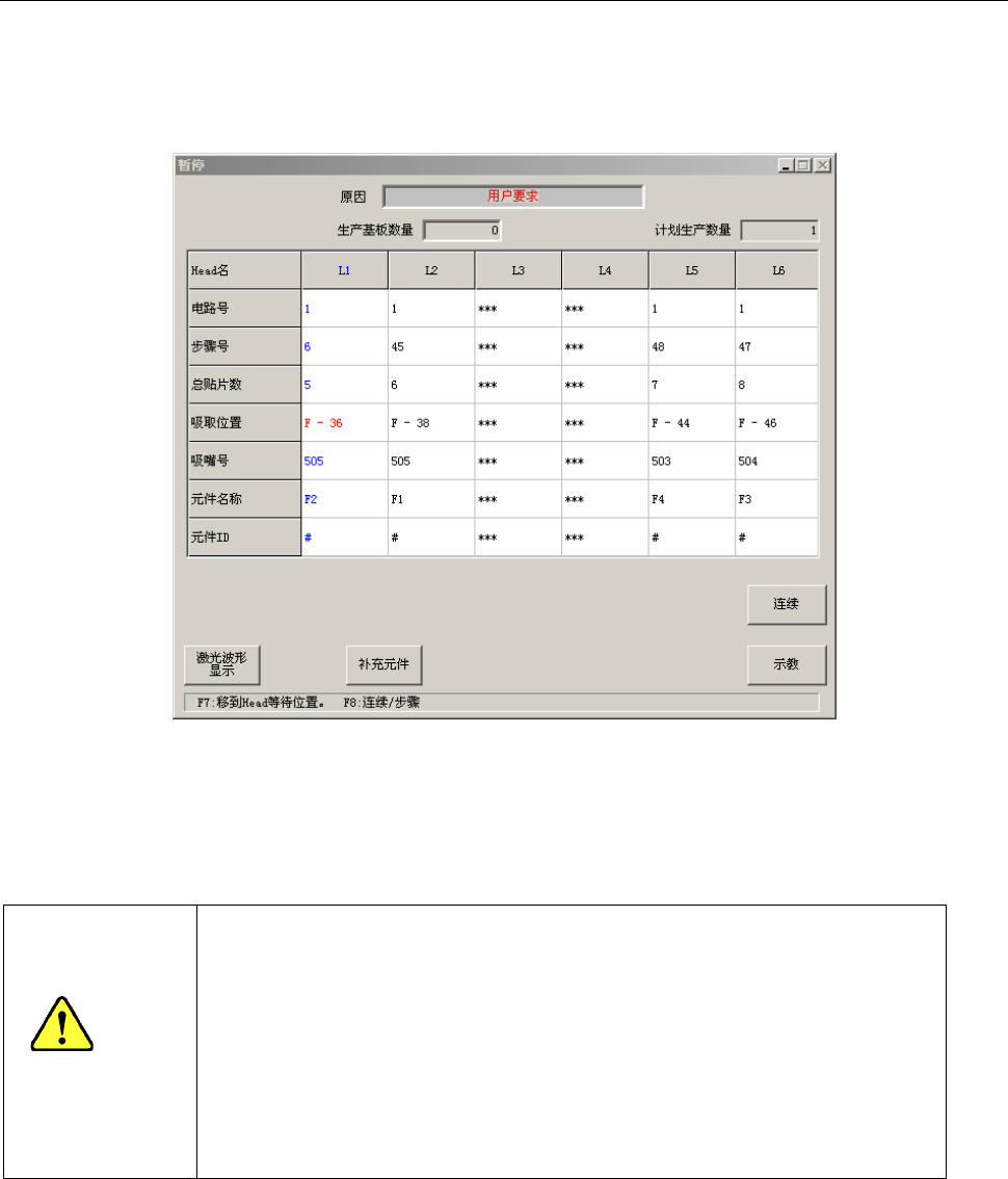2) 在步骤生产中停止,或在连续生产中暂停时,按下键盘“F7”键,可将贴片头移动到等