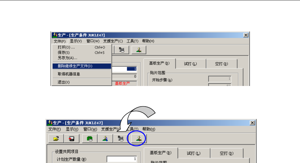 第 1 部 基本篇 第 2 章 生产 2-104 2-11-9-3 删除继续生产文件 继续生产数据存在时, 菜单栏中的 “文件” / “删除继续生产文件” 与工具栏的按钮显示为有效。 若要在开始前删除继续生产文件,请选择此项。 图2-11-9-3-1 确认删除继续生产文件画面(菜单画面) 图2-11-9-3-2 确认删除继续生产文件画面(工具栏上的按钮)