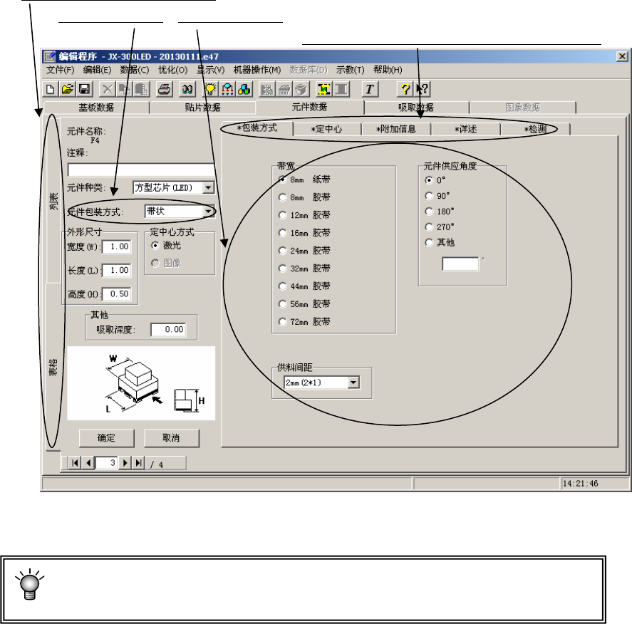 元件数据的制作画面(元件表)包含初始画面在内,共由5个画面(“包装方式”、“定中心”、“附