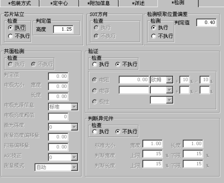 对“芯片站立”、“SOT方向检查”、“检测吸取位置偏差”、“判断异元件”进行设置。