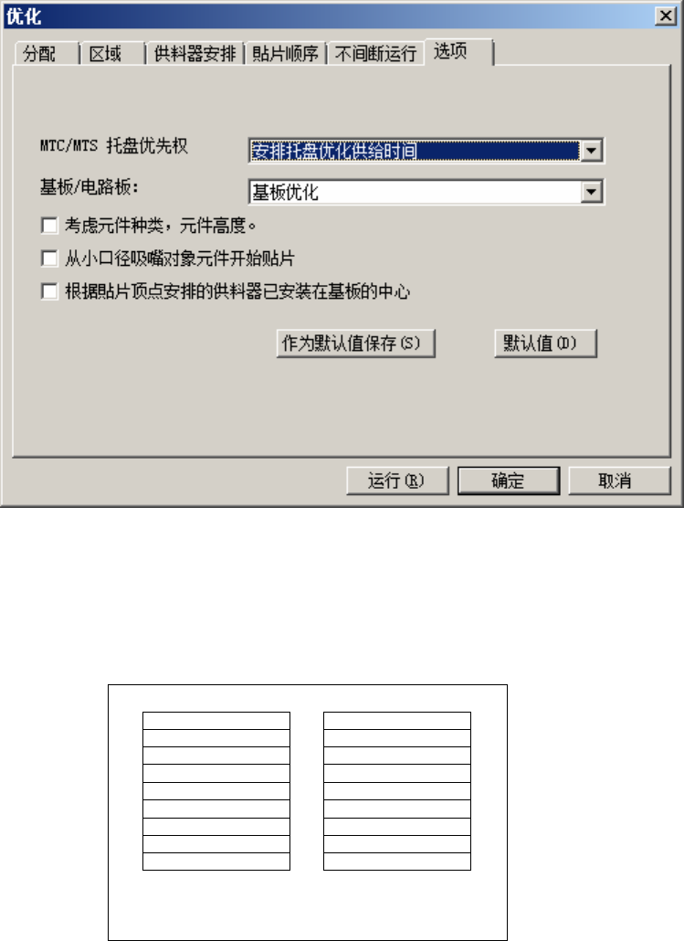 第 1 部 基本篇 第 4 章 制作生产程序 4-86 (6)选项 选择“选项”选项卡,则显示下图的对话框。 1) MTC/MTS 托盘优先权(指定同一托盘集中配置) 设置对 MTS 供应的同一种类托盘元件,是统一配置,还是以供给速度优先配置。 ● 同一托盘集中配置:以同一元件种类为单位配置。 ● 安排托盘优化供给时间:以供给速度优先配置。 图 エラー ! 指定したスタイルは使われていません。 -1 同一托盘元件的配置示例 2) 基板/…