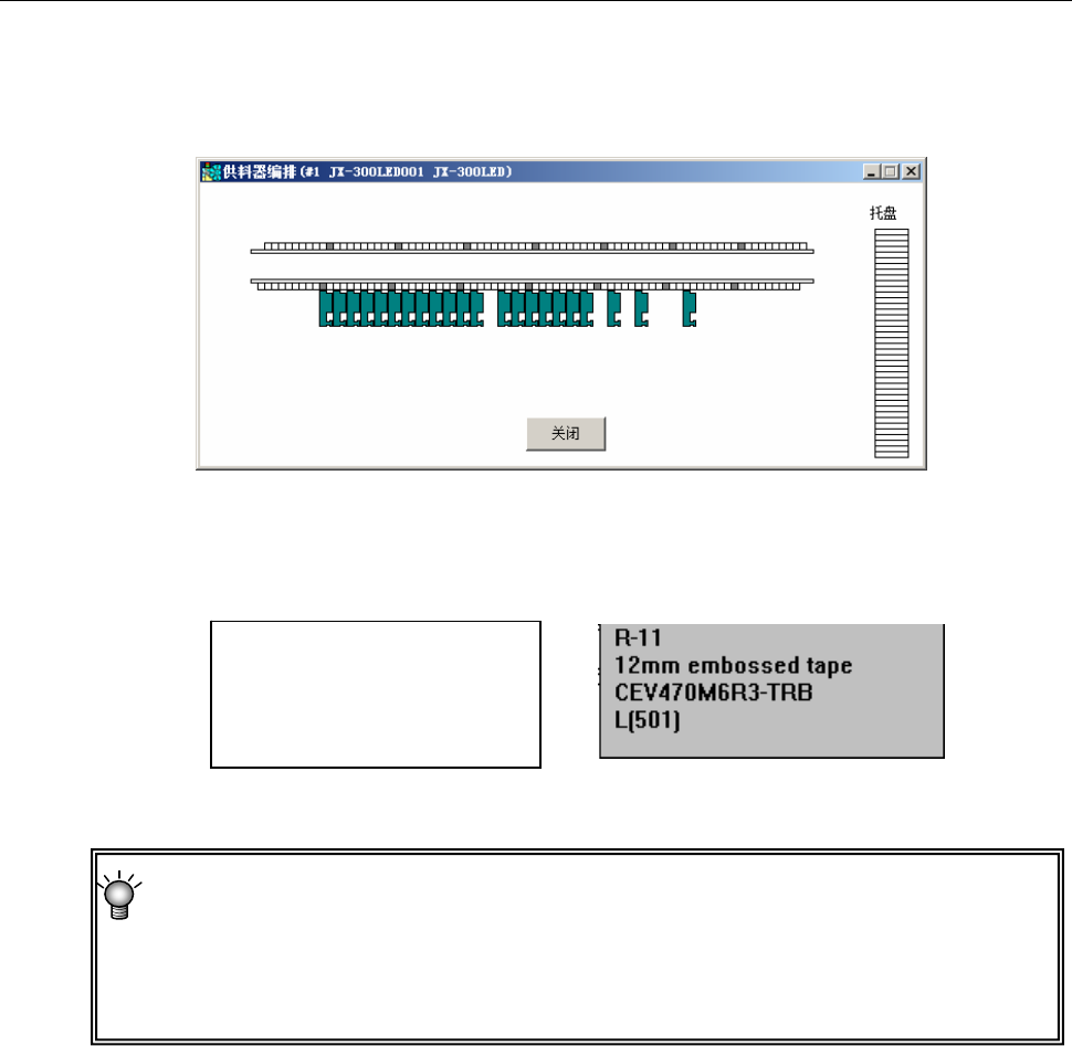 ① 将轨道球移动到供料器编排窗口的供料器图上,即可显示该供料器的元件数据的部分内容。